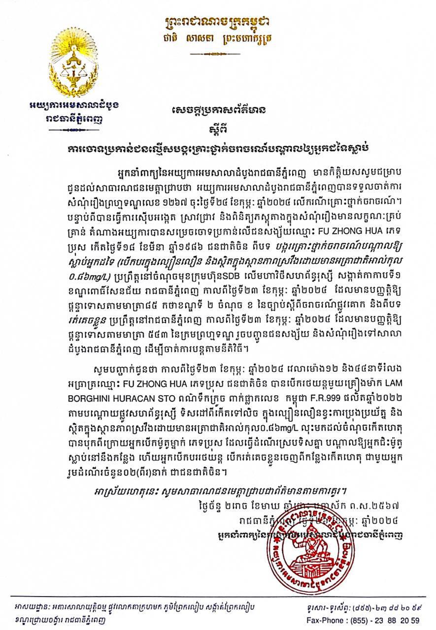 (ភ្នំពេញ)៖ អ្នកនាំពាក្យ នៃអយ្យការអមសាលាដំបូងរាជធានីភ្នំពេញ បានចេញសេចក្ដីប្រកាសព័ត៌មាន ស្ដីពីការចោទប្រកាន់ជនជាតិចិនម្នាក់ ដែលបើករថយន្ដ LAMBORGHINI បុកអ្នកជិះម៉ូតូបណ្ដាលឲ្យបាត់បង់ជីវិត។