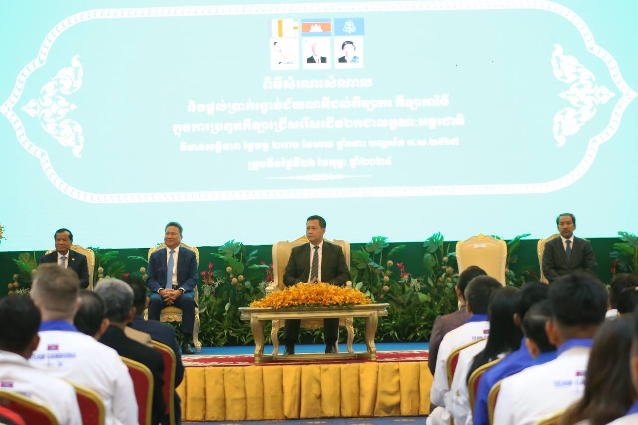 (ភ្នំពេញ)៖ សម្ដេចមហាបវរធិបតី ហ៊ុន ម៉ាណែត នាយករដ្ឋមន្ដ្រីនៃកម្ពុជា នៅរសៀលថ្ងៃទី២៦ ខែកុម្ភៈ ឆ្នាំ២០២៤នេះ ក្នុងឱកាសប្រគល់ប្រាក់រង្វាន់លើកទឹកចិត្តរបស់រាជរដ្ឋាភិបាល ជូនជ័យលាភីមេដាយមាស ប្រាក់ និង មេដាយសំរឹទ្ធិ គ្រូបង្វឹក និងគ្រូជំនួយពីការប្រកួតកីឡានានា បានលើកឡើងថា វិស័យកីឡា បានដើរតួនាទីយ៉ាងសំខាន់ ក្នុងវិស័យការទូត និងទំនាក់ទំនងអន្ដរជាតិ។