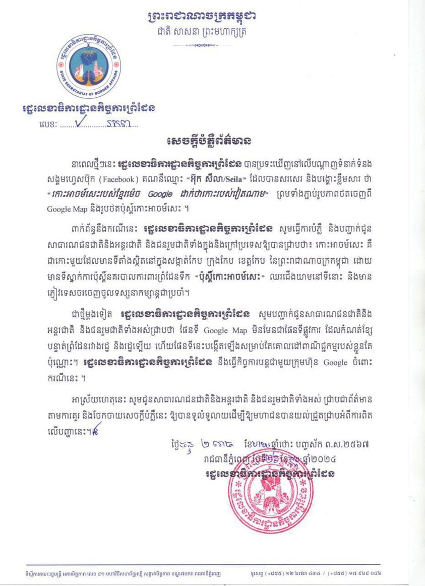 ជាថ្មីម្តងទៀត រដ្ឋលេខាធិការដ្ឋានកិច្ចការព្រំដែន សូមបញ្ជាក់ជូនសាធារណជនជាតិនិង អន្តរជាតិ និងជនរួមជាតិទាំងអស់ជ្រាបថា ផែនទី Google Map មិនមែនជាផែនទីផ្លូវការ ដែលកំណត់ខ្សែ បន្ទាត់ព្រំដែនរវាងរដ្ឋ និងរដ្ឋឡើយ ហើយផែនទីនេះបង្កើតឡើងសម្រាប់តែគោលដៅពាណិជ្ជកម្មរបស់ខ្លួនតែ ប៉ុណ្ណោះ។ រដ្ឋលេខាធិការដ្ឋានកិច្ចការព្រំដែន នឹងធ្វើកិច្ចការបន្តជាមួយក្រុមហ៊ុន Google ចំពោះ ករណីនេះ ។