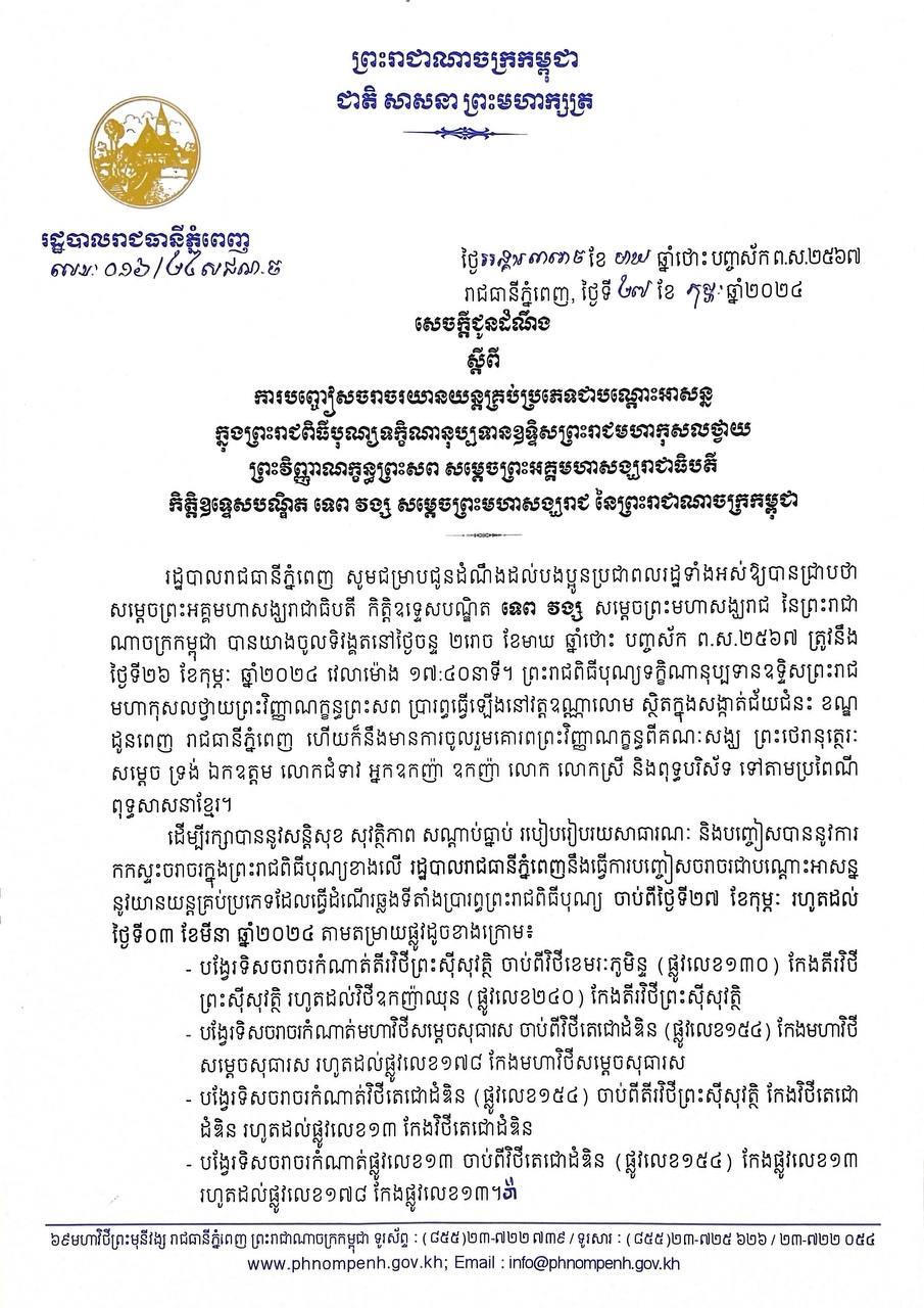 រដ្ឋបាលរាជធានីភ្នំពេញ ជូនដំណឹងពីការបញ្ចៀសចរាចរក្នុងព្រះរាជពិធីបុណ្យ សម្តេចព្រះអគ្គមហាសង្ឃរាជាធិបតី កិត្តិឧទ្ទេសបណ្ឌិត ទេព វង្ស