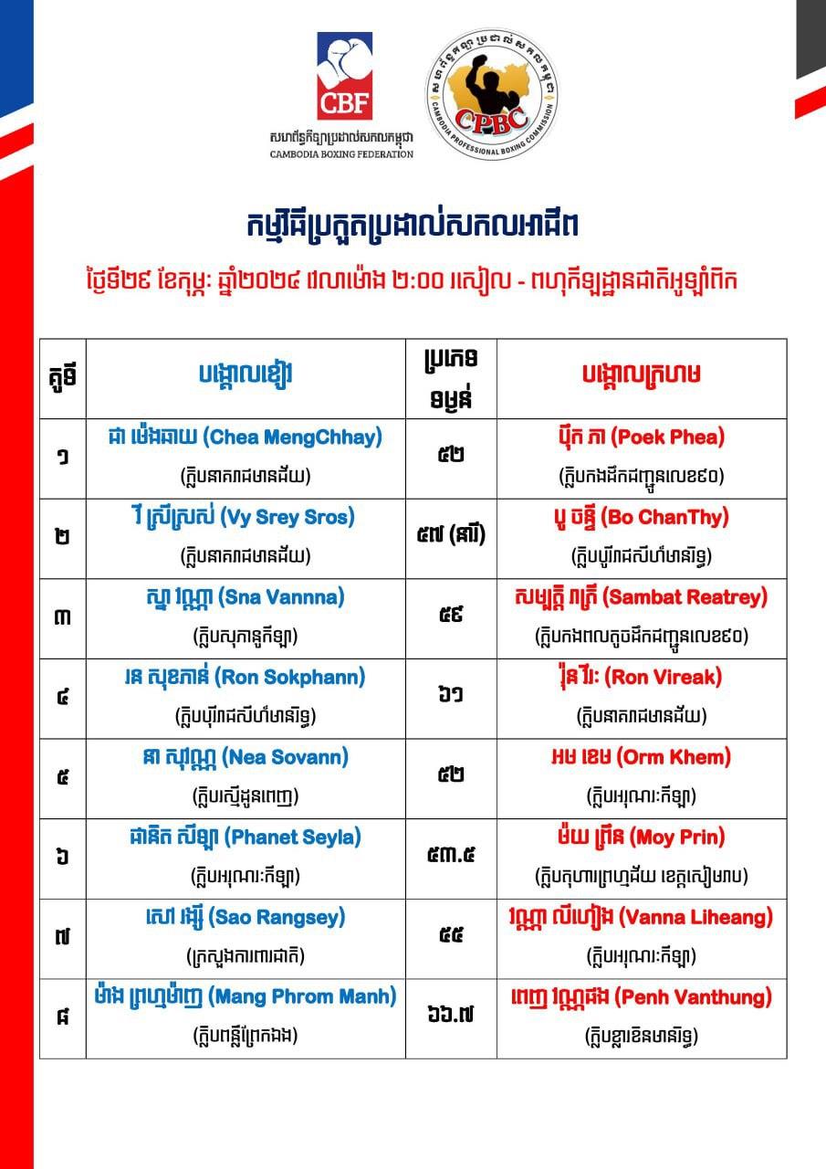 យោងតាមការជូនដំណឹងរបស់សហព័ន្ធ ការប្រកួតលក្ខណៈអាជីពនេះ នឹងមាន ៨គូ ដែលតម្រូវឲ្យប្រកួតស្របតាមបទបញ្ជាការប្រកួត និងបទប្បញ្ញត្តិរបស់ក្រុមប្រឹក្សាប្រដាល់ពិភពលោក (WBC)។ ការប្រកួតនឹងធ្វើឡើងនៅសង្វៀនដំបូលទូក នៃពហុកីឡដ្ឋានជាតិអូឡាំពិក ដែលអ្នកគាំទ្រអាចចូលរួមទស្សនាដោយសេរី។