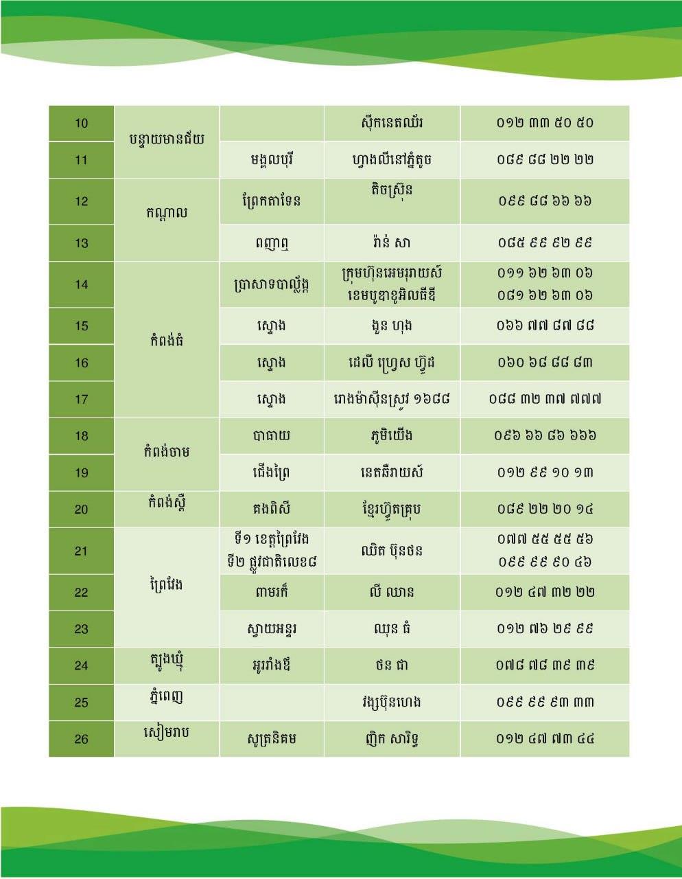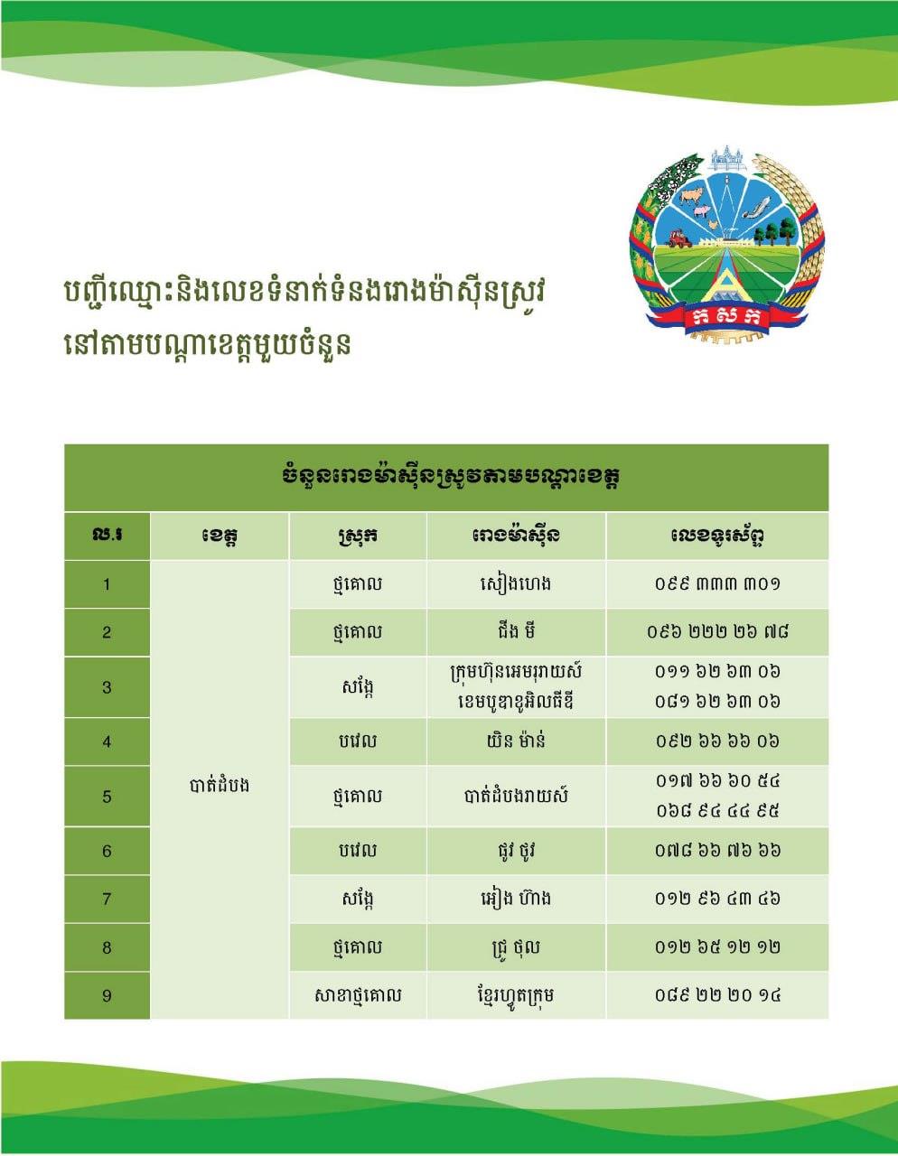 (ភ្នំពេញ)៖ ក្រសួងកសិកម្ម រុក្ខាប្រមាញ់ និងនេសាទ បានបង្ហាញបញ្ជីឈ្មោះ និងលេខទំនាក់ទំនងរោងម៉ាស៊ីនស្រូវ នៅតាមបណ្ដាខេត្តមួយចំនួន៕