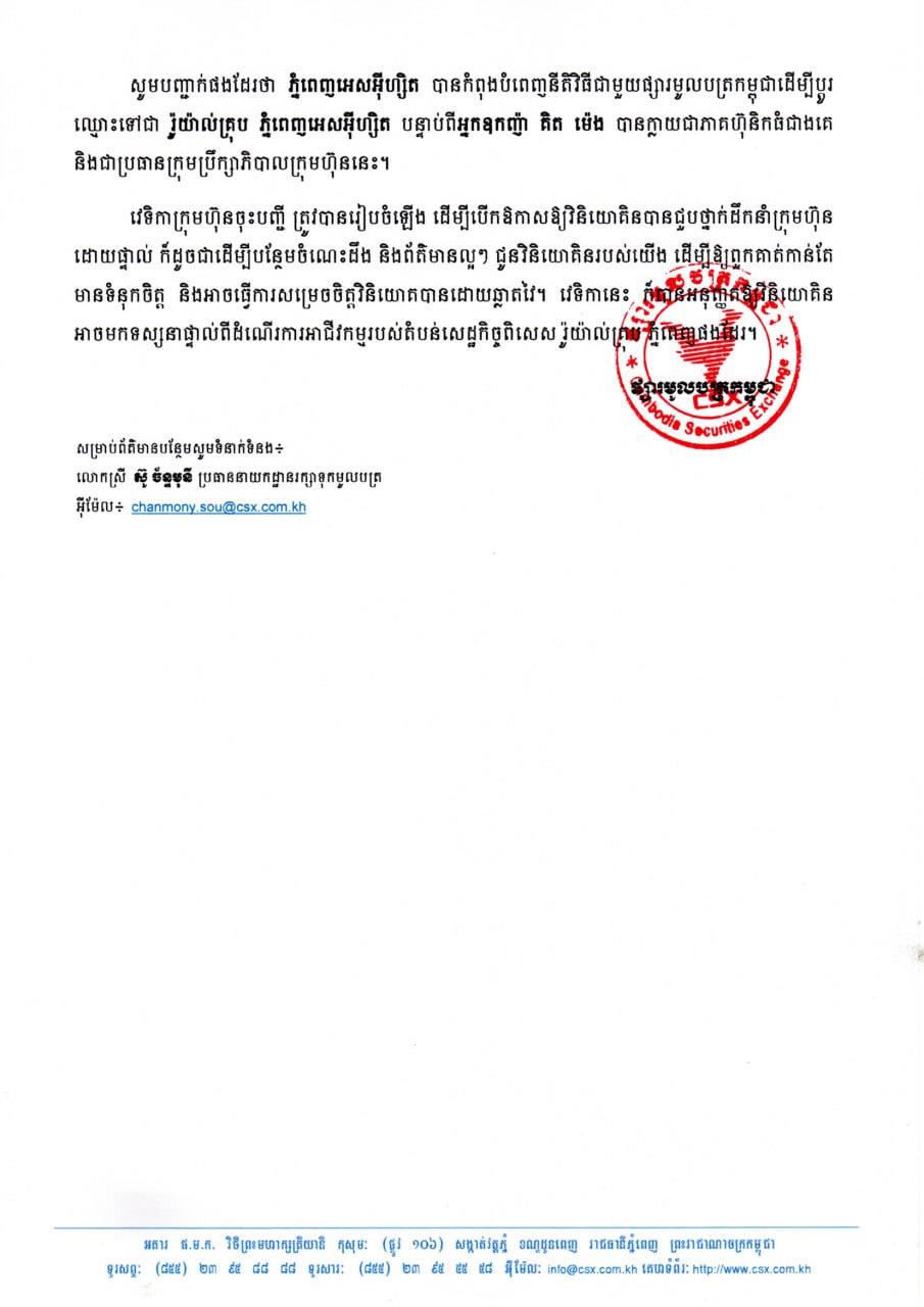 លោក ហុង សុហួរ ប្រតិភូរាជរដ្ឋាភិបាលទទួលបន្ទុក ជាអគ្គនាយកផ្សារមូលបត្រកម្ពុជា បានលើកឡើងថា ថ្លៃភាគហ៊ុនរបស់តំបន់សេដ្ឋកិច្ចពិសេស រ៉ូយ៉ាល់គ្រុប ភ្នំពេញ មានសភាពធូរថ្លៃខ្លាំងបើធៀប នឹងភាពរីកចម្រើនរបស់ក្រុមហ៊ុន ក្នុងរយៈពេលប៉ុន្នានឆ្នាំនេះ និងលើកទឹកចិត្តឱ្យវិនិយោគិន ងាកមកវិនិយោគរយៈពេលវែង ក្នុងបរិបទនៃស្ថានភាពទីផ្សារបច្ចុប្បន្ន។
