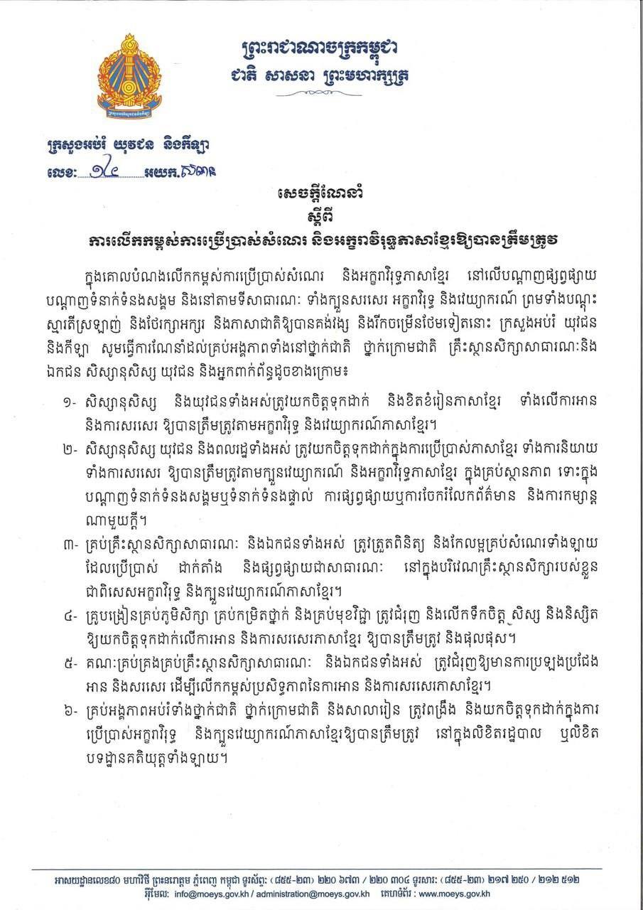 ក្រសួងអប់រំ ចេញសេចក្ដីណែនាំ ស្ដីពី ការលេីកកម្ពស់ការប្រេីប្រាស់សំណេរ និងអក្ខារាវិរុទ្ធភាសាខ្មែរ ឲ្យបានត្រឹមត្រូវ