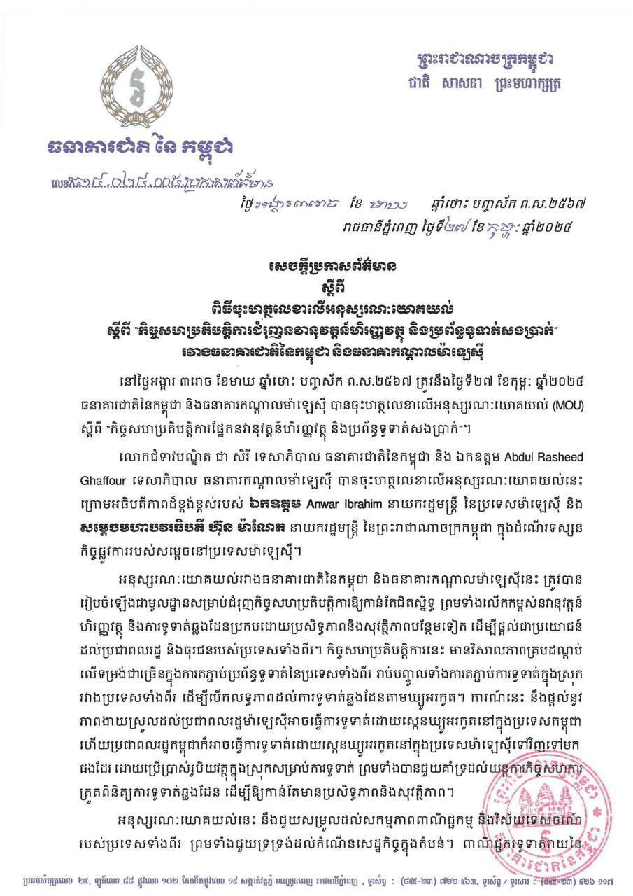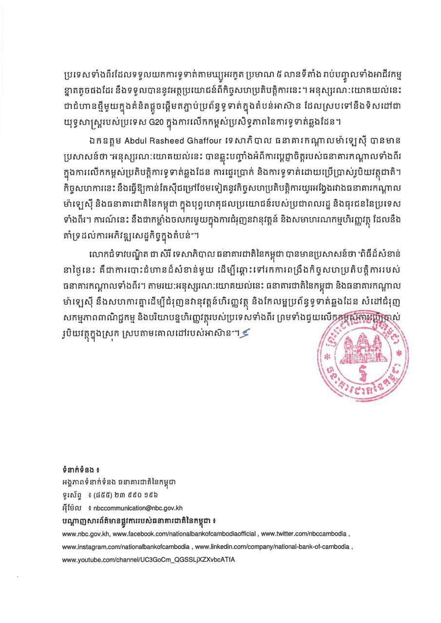 យោងតាមសេចក្តីប្រកាសព័ត៌មានរបស់ធនាគារជាតិបានគូសបញ្ជាក់ថា អនុស្សរណៈយោគយល់រវាងធនាគារជាតិនៃកម្ពុជា និងធនាគារកណ្ដាលម៉ាឡេស៊ីនេះ ត្រូវបានរៀបចំឡើងជាមូលដ្ឋានសម្រាប់ កិច្ចសហប្រតិបត្តិការ មានវិសាលភាពគ្របដណ្តប់លើទម្រង់ជាច្រើន ក្នុងការតភ្ជាប់ប្រព័ន្ធទូទាត់នៃប្រទេសទាំងពីរ រាប់បញ្ចូលទាំងការតភ្ជាប់ការទូទាត់ក្នុងស្រុករវាងប្រទេសទាំងពីរ ដើម្បីបើកលទ្ធភាពដល់ការទូទាត់ឆ្លងដែនតាម QR Code។