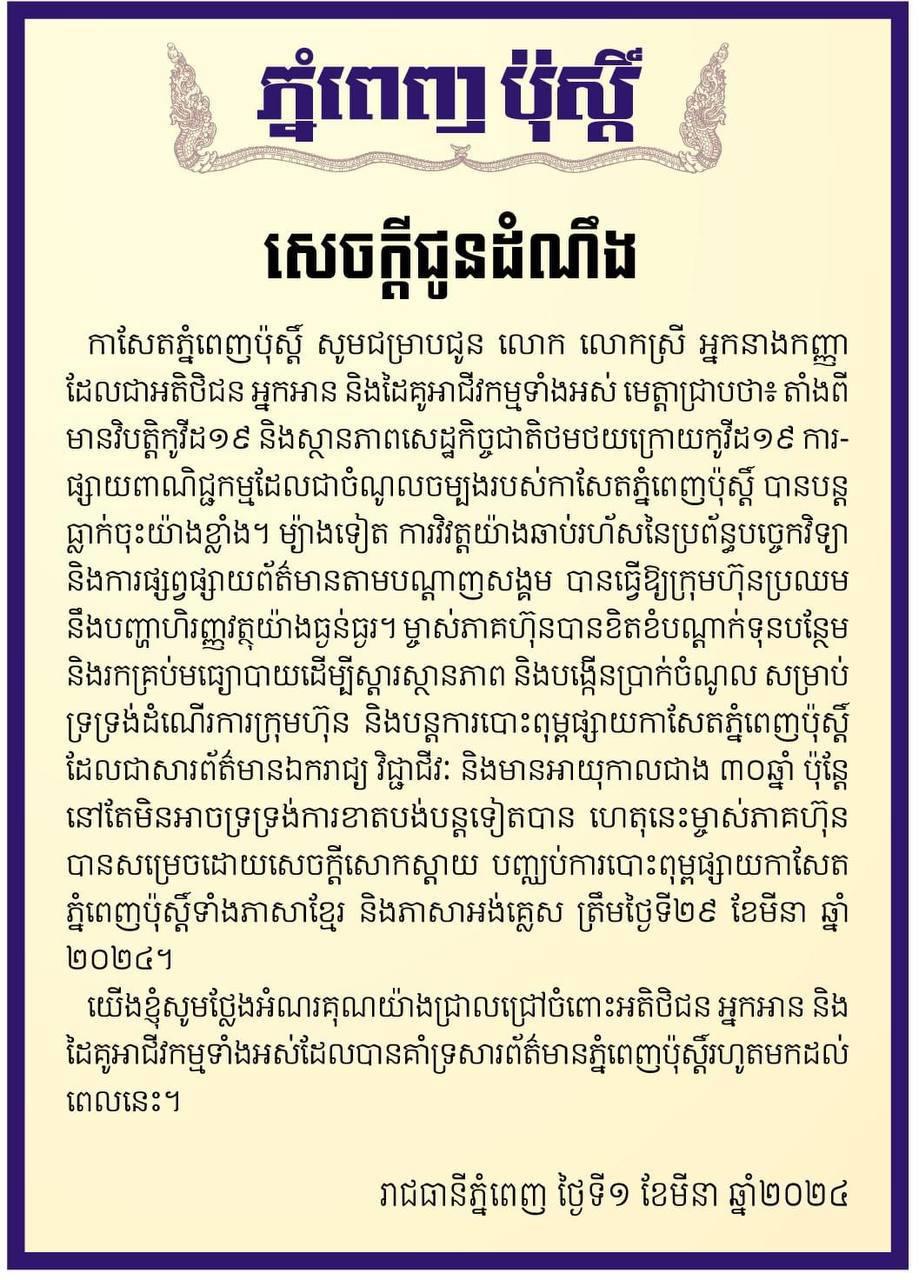 ភ្នំពេញប៉ុស្តិ៍ ប្រកាសបញ្ឈប់ការបោះពុម្ពផ្សាយកាសែតទាំងភាសាខ្មែរ និងភាសាអង់គ្លេស ត្រឹមថ្ងៃទី២៩ ខែមីនា ២០២៤