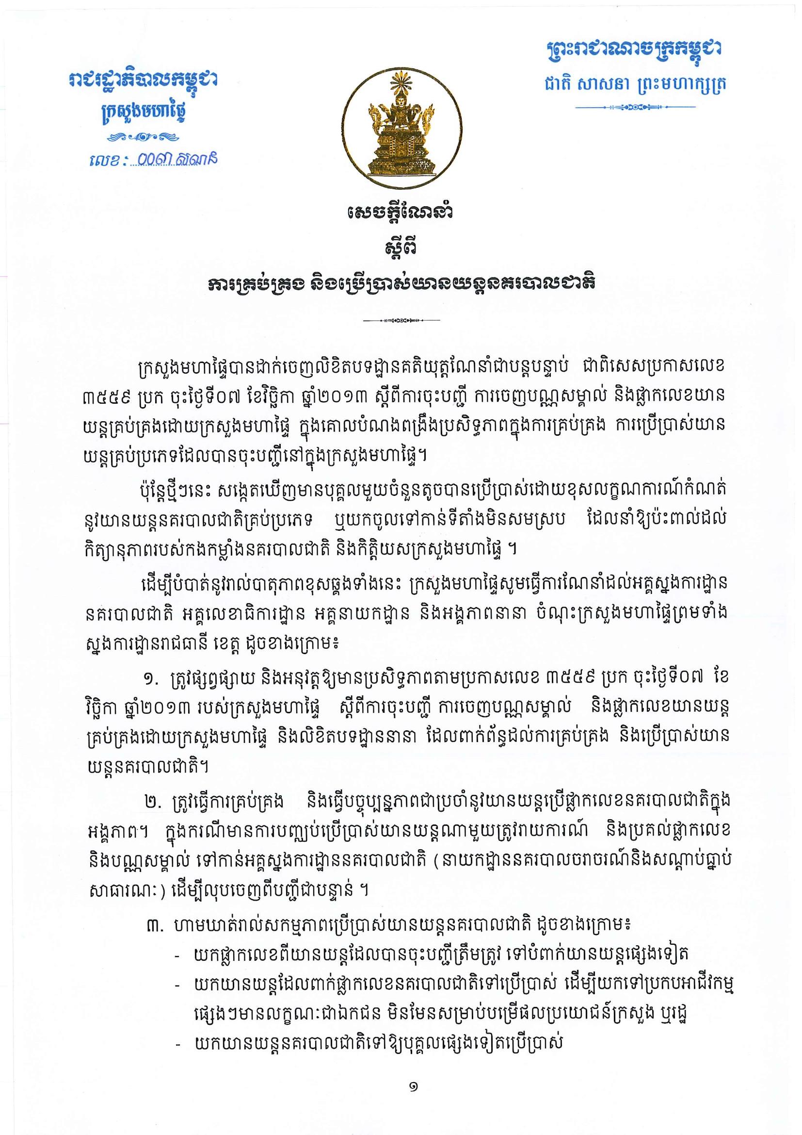 ១. ត្រូវផ្សព្វផ្សាយ និងអនុវត្តឱ្យមានប្រសិទ្ធភាពតាមប្រកាសលេខ ៣៥៥៩ ប្រក ចុះថ្ងៃទី០៧ ខែ វិច្ឆិកា ឆ្នាំ២០១៣ របស់ក្រសួងមហាផ្ទៃ ស្តីពីការចុះបញ្ជី ការចេញបណ្ណសម្គាល់ និងផ្លាកលេខយានយន្តគ្រប់គ្រងដោយក្រសួងមហាផ្ទៃ និងលិខិតបទដ្ឋាននានា ដែលពាក់ព័ន្ធដល់ការគ្រប់គ្រង និងប្រើប្រាស់យាន យន្តនគរបាលជាតិ។