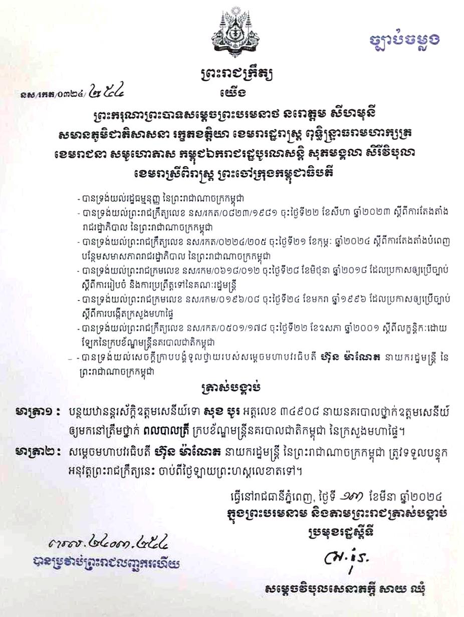 (ភ្នំពេញ)៖ សម្តេចវិបុលសេនាភក្តី សាយ ឈុំ ប្រមុខរដ្ឋស្តីទី បានចេញព្រះរាជក្រឹត្យត្រាស់បង្គាប់បន្ថយឋានន្តរស័ក្តិថ្នាក់មន្ត្រីនគរបាល ថ្នាក់ឧត្តមសេនីយ៍ចំនួន ២រូប ក្របខ័ណ្ឌមន្ត្រីនគរបាលជាតិ ឱ្យមកត្រឹមពលបាលត្រី។ នេះបើតាមព្រះរាជក្រឹត្យ ដែលបណ្តាញ Fresh News ទទួលបាននៅថ្ងៃទី១៤ ខែមីនា ឆ្នាំ២០២៤។