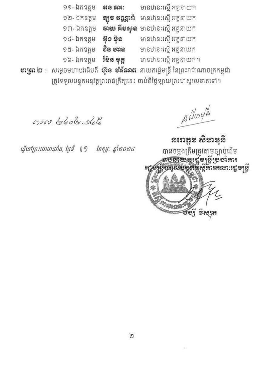 យោងតាមព្រះរាជក្រឹត្យរបស់ព្រះមហាក្សត្រ, ទីប្រឹក្សាដែលត្រូវបានបញ្ចប់មុខតំណែង ដែលមានឋានៈស្មើចាប់ពីអគ្គនាយក ដល់រដ្ឋលេខាធិការ ចំនួន១៦នាក់។ ដោយឡែក អនុក្រឹត្យរបស់សម្ដេចធិបតី ហ៊ុន ម៉ាណែត វិញ ទីប្រឹក្សា និងជំនួយការ ដែលត្រូវបញ្ចប់មុខតំណែងមានឋានៈស្មើចាប់ពីប្រធាននាយកដ្ឋាន ដល់អគ្គនាយករង ចំនួន២៥នាក់។