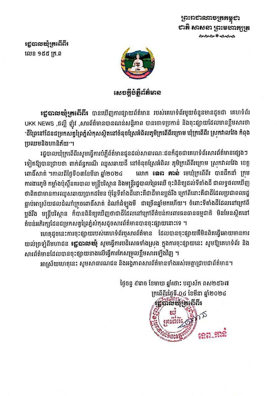 អាជ្ញាធរសូមបញ្ជាក់ជូនថា ពាក់ព័ន្ធករណីឈូសឆាយដី នៅចំណុចស្រែអំពិល ភូមិក្រពើពីរក្រោម ស្រុកវាលវែង ខេត្តពោធិ៍សាត់។ កាលពីថ្ងៃទី៣ ខែមីនា ឆ្នាំ២០២៤ លោក ទេព កាន់ មេឃុំក្រពើពីរ បានដឹកនាំក្រុមការងារភូមិ កម្លាំងប៉ុស្តិ៍នគរបាល មន្ត្រីបរិស្ថាន និងមន្ត្រីរដ្ឋបាលព្រៃឈើ ចុះពិនិត្យដល់ទីតាំងដី ជាលទ្ធផលឃើញថា ពិតជាមានការឈូសឆាយប្រាកដមែន ប៉ុន្តែទីតាំងដីនោះគឺជាដីមានប្លង់រឹង ក្រៅពីនោះគឺជាដីដែលប្រជាពលរដ្ឋ ធ្លាប់អាស្រ័យផលដំណាំក្រូចពោធិ៍សាត់ ដំណាំដំឡូងមី ជាច្រើនឆ្នាំមកហើយ។