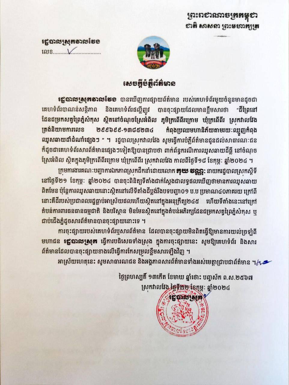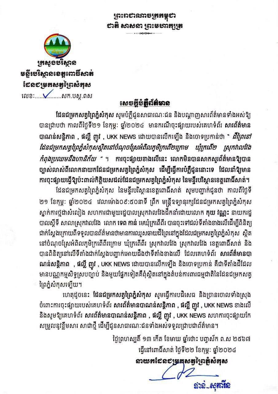 អាជ្ញាធរស្រុកវាលវែង ខេត្តពោធិ៍សាត់​​ ចេញប្រកាសព័ត៌មានច្រានចោលការផ្សព្វផ្សាយ តាមបណ្តាញសង្គមពាក់ព័ន្ធដីព្រៃនៅដែនជម្រកសត្វព្រៃភ្នំសំកុស