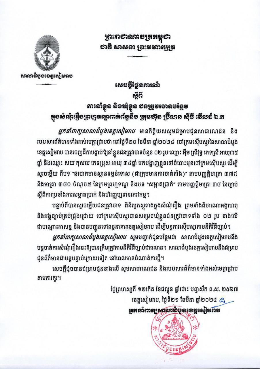 បើតាមសេចក្តីថ្លែងការណ៍, នៅថ្ងៃទី២០ ខែមីនា ឆ្នាំ២០២៤ ចៅក្រមស៊ើបសួរនៃសាលាដំបូង ខេត្តសៀមរាប បានចេញដីកាបង្គាប់ឱ្យនាំខ្លួនជនត្រូវចោទចំនួន ០២ រូបថែមទៀត រួមមាន៖ ឈ្មោះ អ៉ឹម ស្រីវុទ្ធ ភេទស្រី អាយុ៣៥ ឆ្នាំ និងឈ្មោះ សយ កុសល ភេទប្រុស អាយុ ៣៤ឆ្នាំ មកបង្ហាញខ្លួននៅចំពោះមុខចៅក្រមស៊ើបសួរ ដើម្បីសួរចម្លើយ ពីបទ «ឆបោកមានស្ថានទម្ងន់ទោស (ជាក្រុមមានការចាត់តាំង)» តាមបញ្ញត្តិមាត្រា ៣៧៧ និងមាត្រា ៣៨០ ចំណុច៥ នៃក្រមព្រហ្មទណ្ឌ និងបទ «សម្អាតប្រាក់» តាមបញ្ញត្តិមាត្រា ៣៨ នៃច្បាប់ ស្តីពីការប្រឆាំងការសម្អាតប្រាក់ និងហិរញ្ញប្បទានភេរវកម្ម។ បន្ទាប់ពីបានសួរចម្លើយជនត្រូវចោទ ពិនិត្យភស្តុតាងក្នុងសំណុំរឿង ព្រមទាំងពិចារណាអង្គហេតុ និងអង្គច្បាប់គ្រប់ជ្រុងជ្រោយ ចៅក្រមស៊ើបសួរបានសម្រេចឃុំខ្លួនជនត្រូវចោទទាំង ០២ រូប ខាងលើ ជាបណ្តោះអាសន្ន និងបានបញ្ជូនទៅពន្ធនាគារខេត្តសៀមរាប ដើម្បីបន្តការស៊ើបសួរតាមនីតិវិធីច្បាប់។