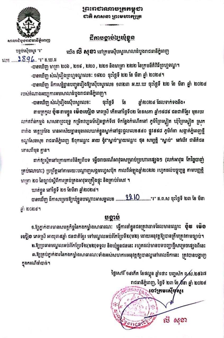 (ភ្នំពេញ)៖ លោក លិ សុខា ចៅក្រមស៊ើបសួរសាលាដំបូងរាជធានីភ្នំពេញ បានដីកាបង្គាប់ឱ្យឃុំខ្លួនស្ត្រីម្នាក់ ដែលជាម្ចាក់គេហទំព័រហ្វេសប៊ុកឈ្មោះ ស្តេចជំពាម KH ដែលបានបង្ហោះលក់អាវុធកែច្នៃប្រើគ្រាប់លោហៈ ពីបទ «ធ្វើចរាចរណ៍អាវុធសម្រាប់ប្រហារផ្សេងៗ លក់អាវុធ កែច្នៃបាញ់ គ្រប់លោហៈ» ដែលបានប្រព្រឹត្តនៅតាមរយៈបណ្តាញសង្គម Facebook កាលពីកំឡុងឆ្នាំ២០២២ រហូតបច្ចុប្បន្ន តាមបញ្ញត្តិមាត្រា ២០ នៃច្បាប់ស្តីពីការគ្រប់គ្រងអាវុធគ្រឿងផ្ទុះ និងគ្រាប់រំសេវ។