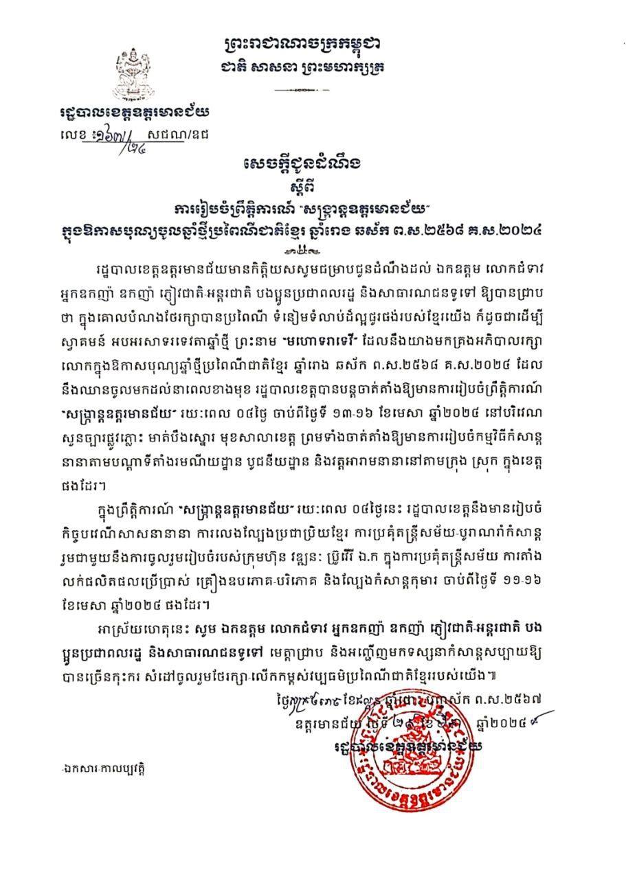 សេចក្តីជូនដំណឹងរបស់រដ្ឋបាលខេត្តឧត្តរមានជ័យបានបញ្ជាក់ថា៖ក្នុងព្រឹត្តិការណ៍«សង្ក្រានឧត្តរមានជ័យ»រយះពេល៤ថ្ងៃនេះ រដ្ឋបាលខេត្តនឹងមានរៀបចំកិច្ចបវេណីសាសនានានា ការលេងល្បែងប្រជាប្រិយខ្មែរ ការប្រគុំតន្ត្រីសម័យ បូរាណរាំកំសាន្ត រួមជាមួយនឹងការចូលរួមរៀបចំរបស់ក្រុមហ៊ុន វឌ្ឍនៈ ប្រូវើរី ឯ.ក ក្នុងការប្រកុំតន្ត្រីសម័យ ការតាំងលក់ផលិតផលប្រើប្រាស់ គ្រឿងឧបភោគ បរិភោគ និងល្បែងកំសាន្តកុមារ ចាប់ពីថ្ងៃទី១១ដល់ថ្ងៃទី១៦ ខែមេសា ឆ្នាំ២០២៤តទៅ៕