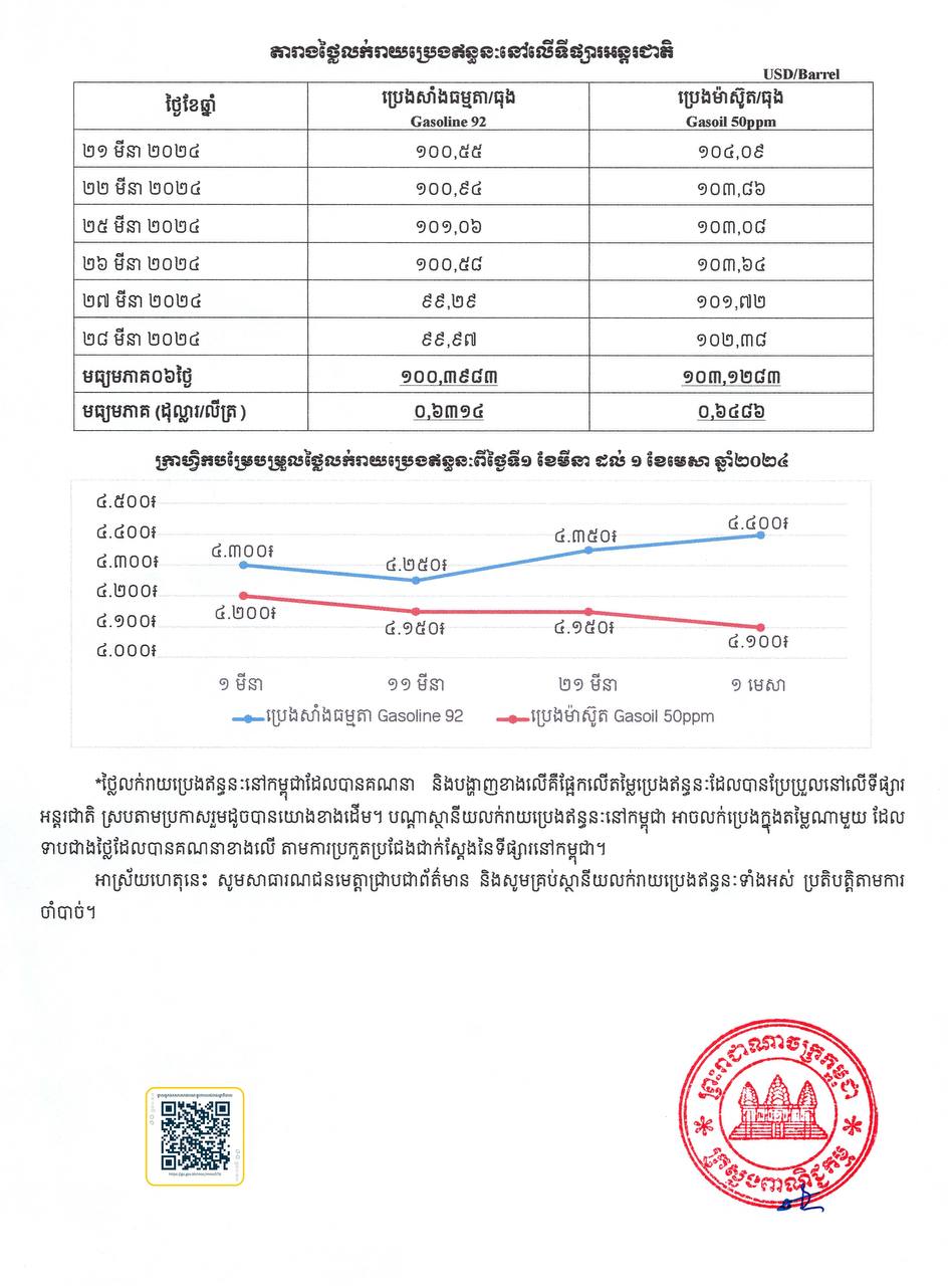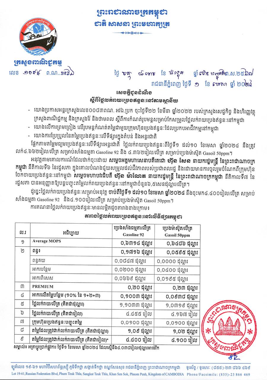 ក្រសួងពាណិជ្ជកម្ម៖ តម្លៃសាំងធម្មតាត្រូវលក់តម្លៃ ៤,៤០០រៀល និងម៉ាស៊ូតលក់តម្លៃ ៤,១០០រៀល ចាប់ពីថ្ងៃនេះ ដល់ថ្ងៃទី១០ ខែមេសា ឆ្នាំ២០២៤
