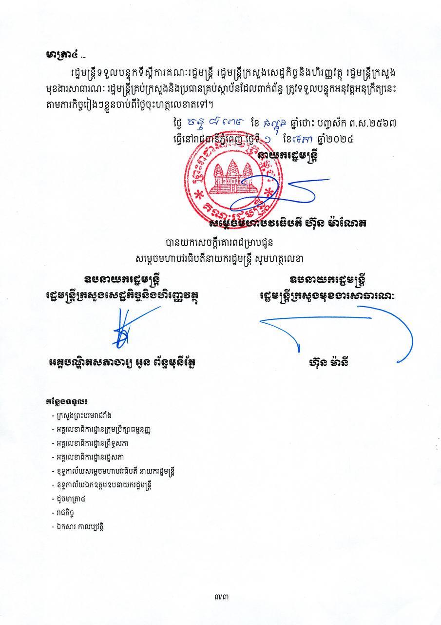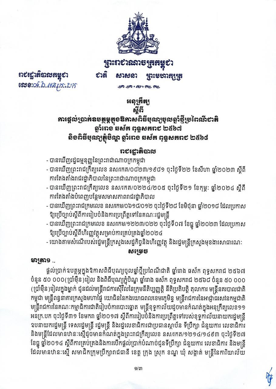 អនុក្រឹត្យបានបញ្ជាក់ទៀតថា ក្រសួងសេដ្ឋកិច្ចនិងហិរញ្ញវត្ថុ និងក្រសួង ស្ថាប័នសាមី ត្រូវសហការ និងចាត់ចែងរៀបចំការបើកផ្ដល់ ជាបុរេប្រទានសម្រាប់ប្រាក់ឧបត្ថម្ភក្នុងឱកាសពិធីបុណ្យចូលឆ្នាំថ្មីដំណាលគ្នាជាមួយការបើកផ្តល់ប្រាក់បៀវត្ស ប្រចាំខែមេសា តែមួយលើកឱ្យបានដល់សាមីជនម្នាក់ៗយ៉ាងយូរបំផុតត្រឹមថ្ងៃទី១២ ខែមេសា ឆ្នាំ២០២៤ និងប្រាក់ឧបត្ថម្ភក្នុងឱកាសបុណ្យភ្ជុំបិណ្ឌដំណាលគ្នាជាមួយនឹងការបើកផ្តល់ប្រាក់បៀវត្សប្រចាំខែកញ្ញា តែមួយលើកឱ្យបានដល់សាមីជនម្នាក់ៗយ៉ាងយូរបំផុតត្រឹមថ្ងៃទី១៥ ខែកញ្ញា ឆ្នាំ២០២៤៕ ផ្តល់សិទ្ធិដោយ៖ freshnews