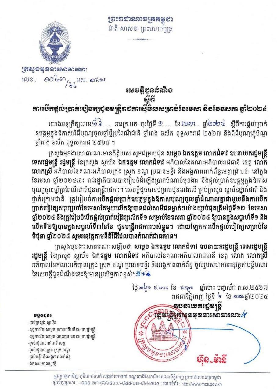 ក្រសួងបានប្រាប់ឱ្យគ្រប់ក្រសួង ស្ថាប័នថ្នាក់ជាតិ និងថ្នាក់ក្រោមជាតិ ត្រូវរៀបចំការបើកផ្ដល់ប្រាក់ឧបត្ថម្ភ ក្នុងឱកាសបុណ្យចូលឆ្នាំដំណាលគ្នា ជាមួយនឹងការបើកប្រាក់បៀវត្ស សរុបប្រចាំខែមេសាតែមួយលើក ឱ្យបានដល់សាមីជនម្នាក់ៗ យ៉ាងយូរបំផុតត្រឹមថ្ងៃទី១២ ខែមេសា ឆ្នាំ២០២៤ និងត្រូវរៀបចំបើកផ្តល់ប្រាក់បៀវត្សលើកទី១ សម្រាប់ខែឧសភា ឆ្នាំ២០២៤ ឱ្យបានក្នុងសប្ដាហ៍ទី១ និងលើកទី២ ឱ្យបានក្នុងសប្ដាហ៍ទី៣ នៃខែជូនមន្ត្រីរាជការរបស់ខ្លួន។
