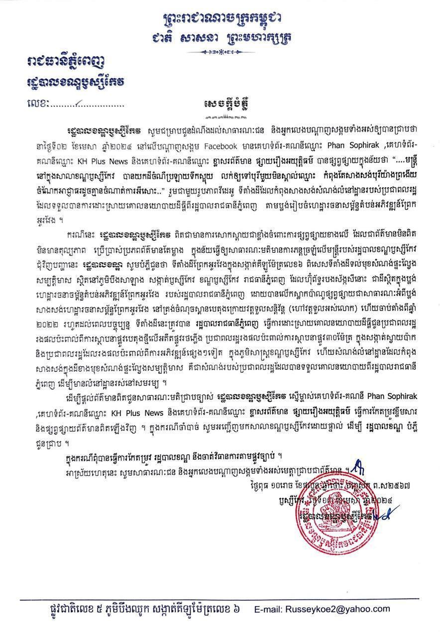 រដ្ឋបាលខណ្ឌឬស្សីកែវ ចេញសេចក្ដីបំភ្លឺ និងច្រានចោលទាំងស្រុងចំពោះការផ្សព្វផ្សាយថា មានមន្ដ្រីនៅក្នុងសាលាខណ្ឌ យកដីចំណីប្រឡាយទឹកស្អុយលក់ឲ្យបុរី