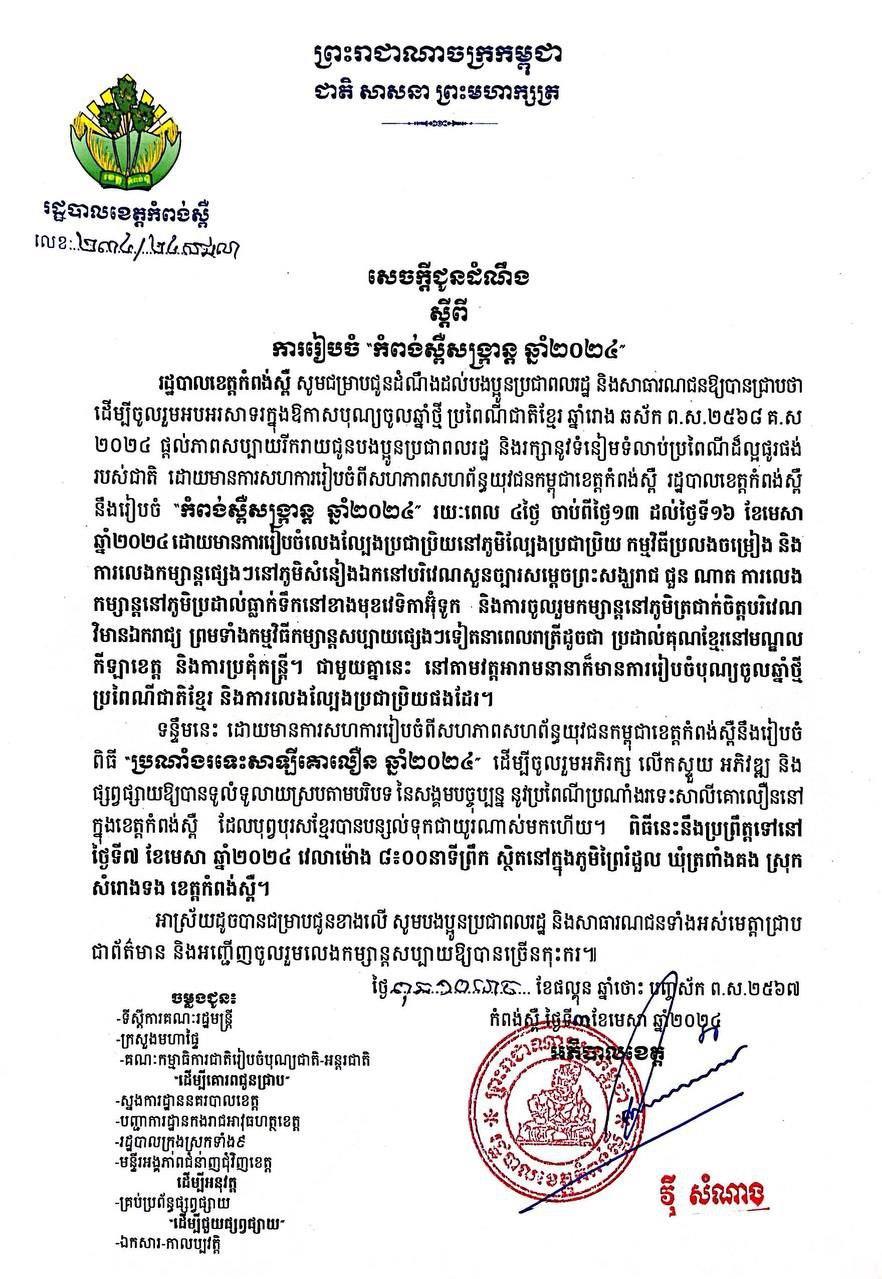 (កំពង់ស្ពឺ)៖ យោងតាមសេចក្តីជូនដំណឹង ស្តីពីការរៀបចំ «កំពង់ស្ពឺសង្ក្រាន្ត» ឆ្នាំ២០២៤ រដ្ឋបាលខេត្តកំពង់ស្ពឺ បានជូនដំណឹងដល់បងប្អូនប្រជាពលរដ្ឋ ឱ្យបានជ្រាបថា ដើម្បីចូលរួមអបអរសាទរក្នុងឱកាសបុណ្យចូលឆ្នាំថ្មី ប្រពៃណីជាតិខ្មែរ ឆ្នាំរោង ឆស័ក ព.ស.២៥៦៨ គ.ស ២០២៤ ផ្តល់ភាពសប្បាយរីករាយជូនបងប្អូនប្រជាពលរដ្ឋ និងរក្សានូវទំនៀមទំលាប់ប្រពៃណីដ៏ល្អផូរផង់របស់ជាតិ ដោយមានការសហការរៀបចំពី សហភាពសហព័ន្ធយុវជនកម្ពុជាខេត្តកំពង់ស្ពឺ រដ្ឋបាលខេត្ត នឹងរៀបចំ «កំពង់ស្ពឺសង្ក្រាន្ត» ឆ្នាំ២០២៤ រយៈពេល៤ថ្ងៃ ចាប់ពីថ្ងៃ១៣ ដល់ថ្ងៃទី១៦ ខែមេសា ឆ្នាំ២០២៤។