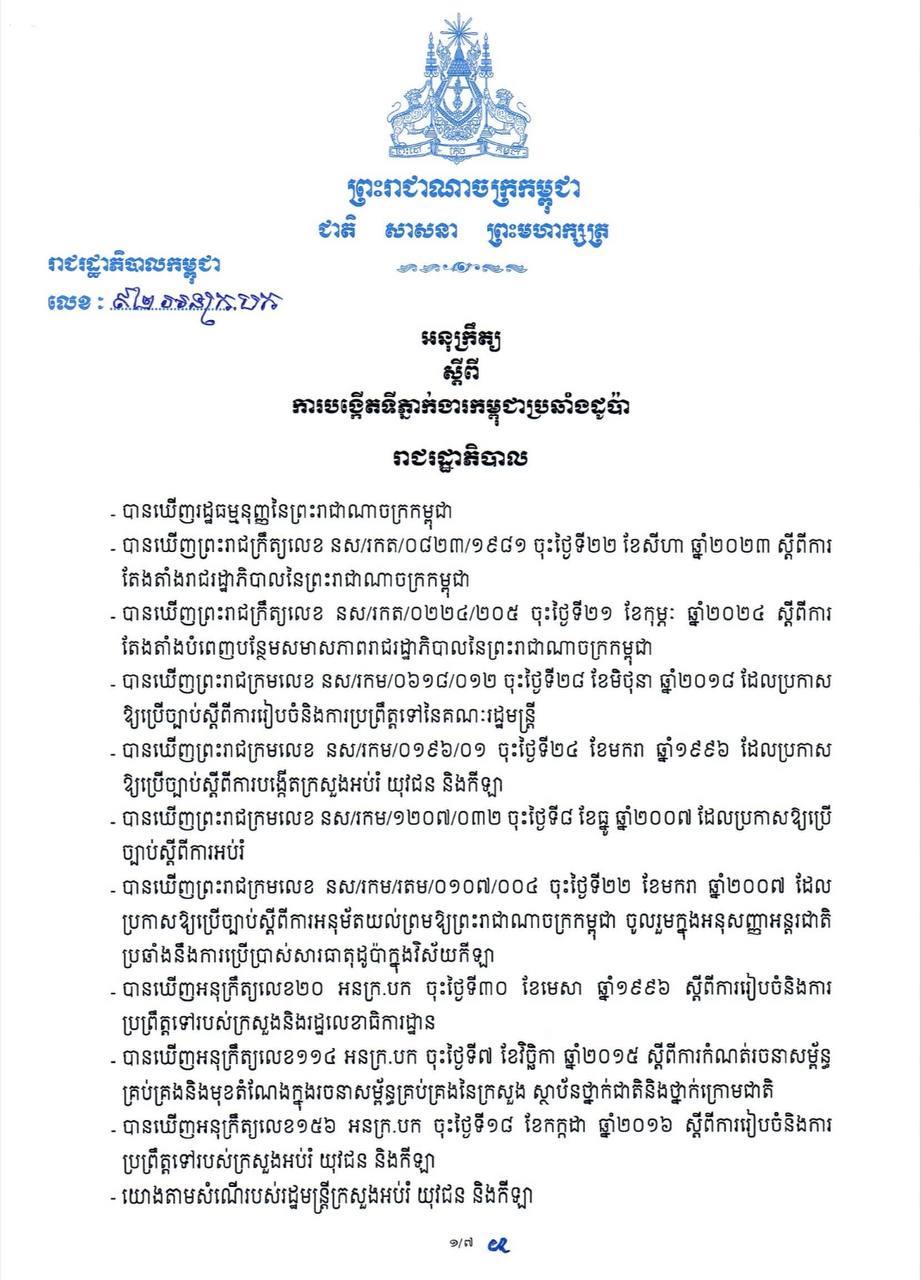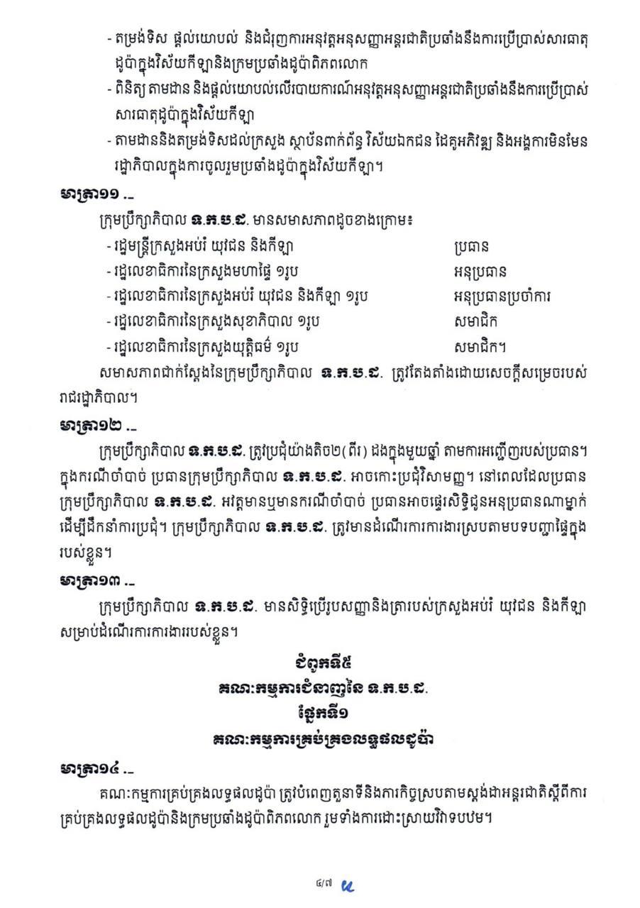 រាជរដ្ឋាភិបាល ចេញអនុក្រឹត្យបង្កើតទីភ្នាក់ងារកម្ពុជាប្រឆាំងដូប៉ា ដើម្បីទប់ស្កាត់សារធាតុហាមឃាត់ក្នុងកីឡា ស្របតាមច្បាប់ WADA