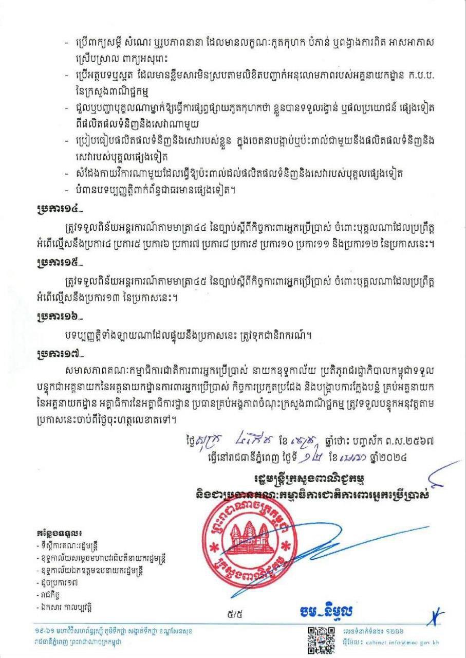 សូមបញ្ជាក់ថា ប្រកាសនេះ កំណត់អំពីការអនុវត្តមិនសុចរិតមួយចំនួនក្នុងធុរកិច្ច ដែលមិនមានចែងក្នុងច្បាប់ ស្តីពីកិច្ចការពារអ្នក ប្រើប្រាស់ ពាក់ព័ន្ធនឹងការផ្សាយពាណិជ្ជកម្ម និងការជំរុញការលក់ ដើម្បីការពារសិទ្ធិ និងផលប្រយោជន៍របស់អ្នកប្រើប្រាស់៕ ផ្តល់សិទ្ធិដោយ៖ Fresh News