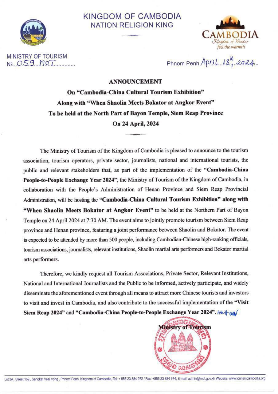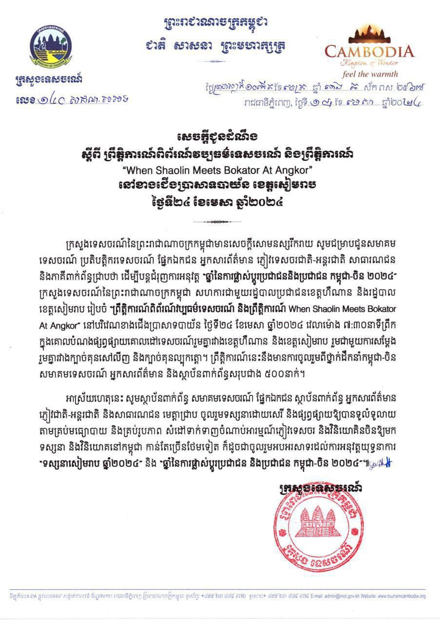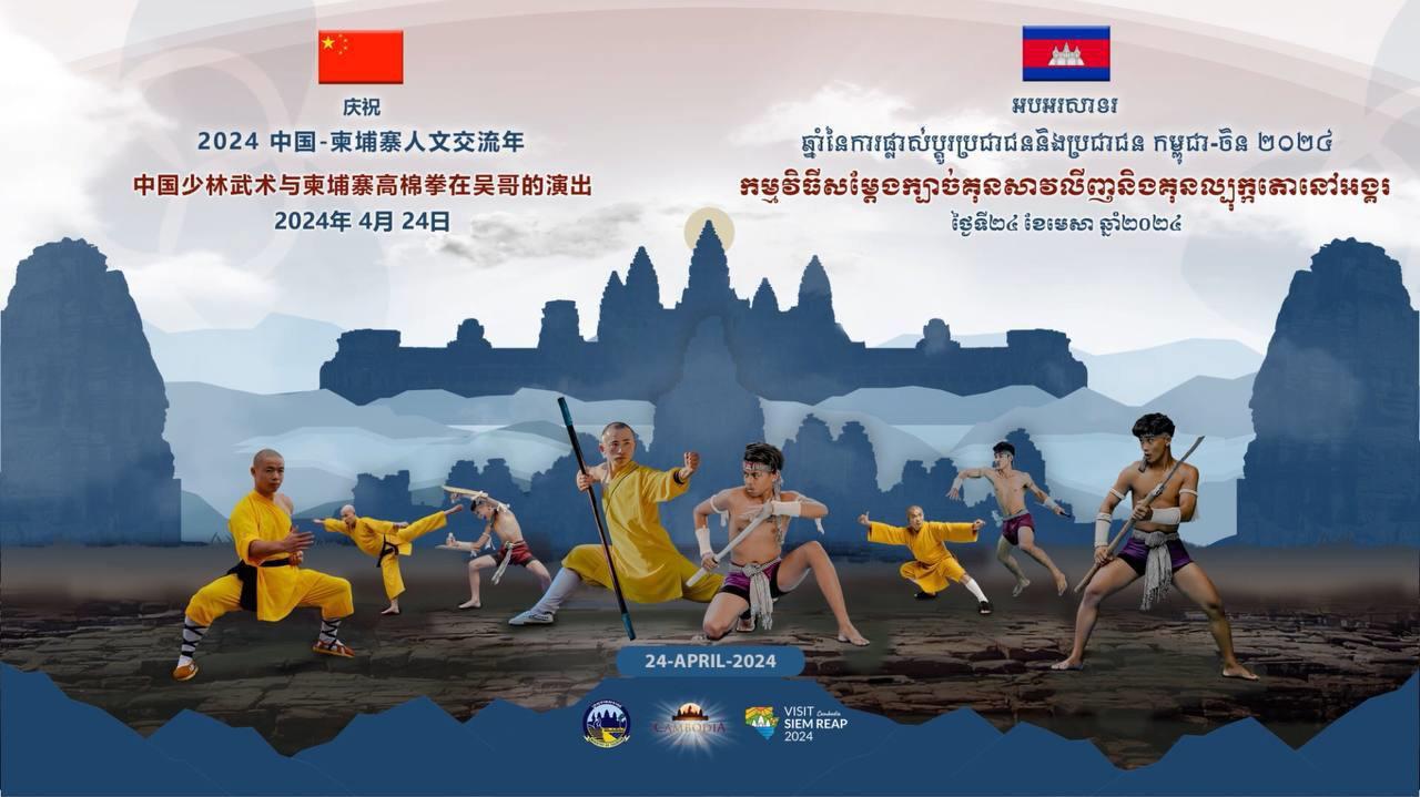 (សៀមរាប)៖ ក្រសួងទេសចរណ៍សហការជាមួយរដ្ឋបាលប្រជាជនខេត្តហឺណាន និងរដ្ឋបាល ខេត្តសៀមរាប រៀបចំព្រឹត្តិការណ៍ពិព័រណ៍វប្បធម៌ទេសចរណ៍ និងព្រឹត្តិការណ៍សម្ដែងក្បាច់គុនល្បុក្កតោ និងក្បាច់គុនសៅលីង នៅលើដែនដីអតីតក្រុងអង្គរធំ នាព្រឹកថ្ងៃទី២៤ ខែមេសា ឆ្នាំ២០២៤ ស្អែកនេះ។