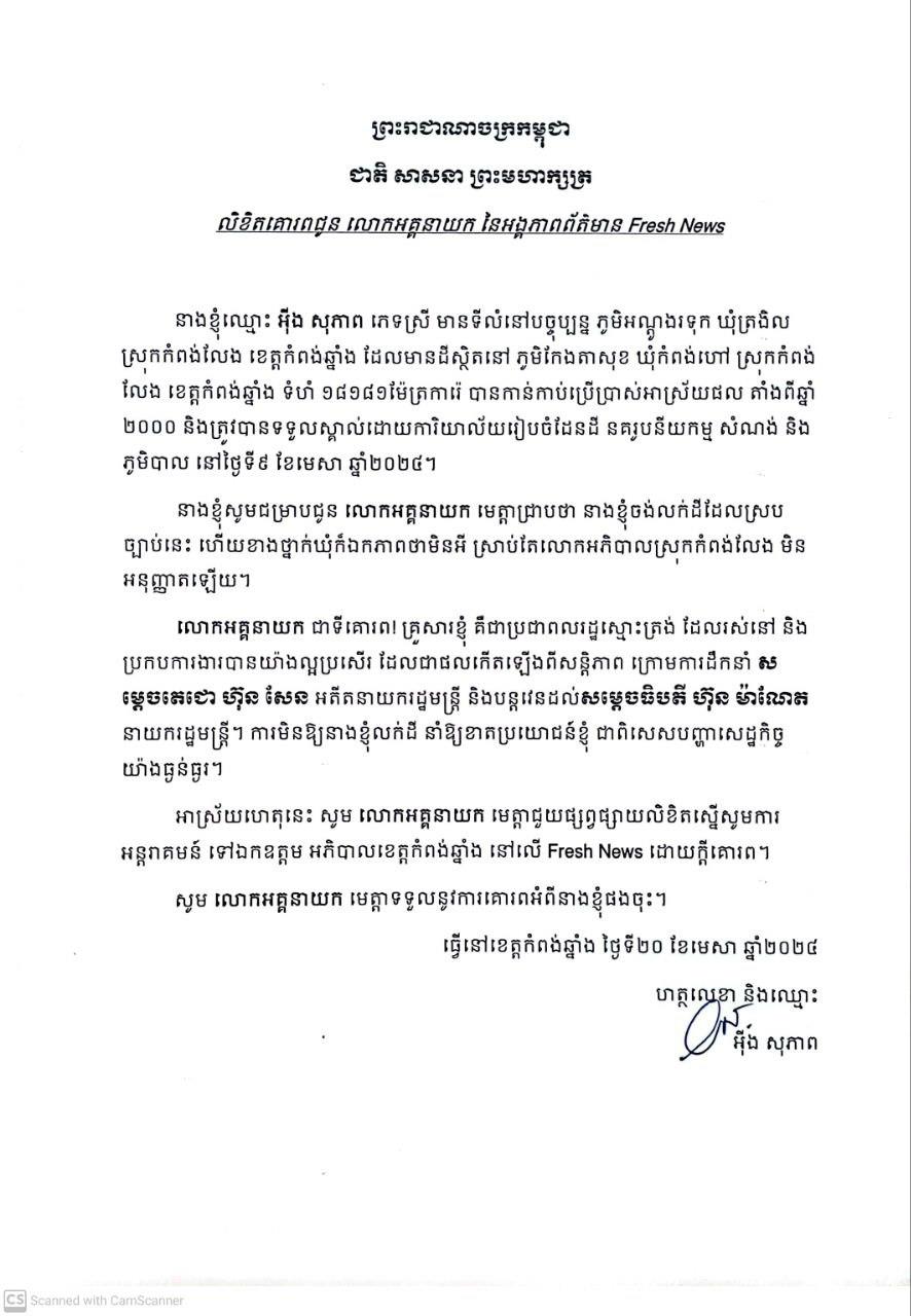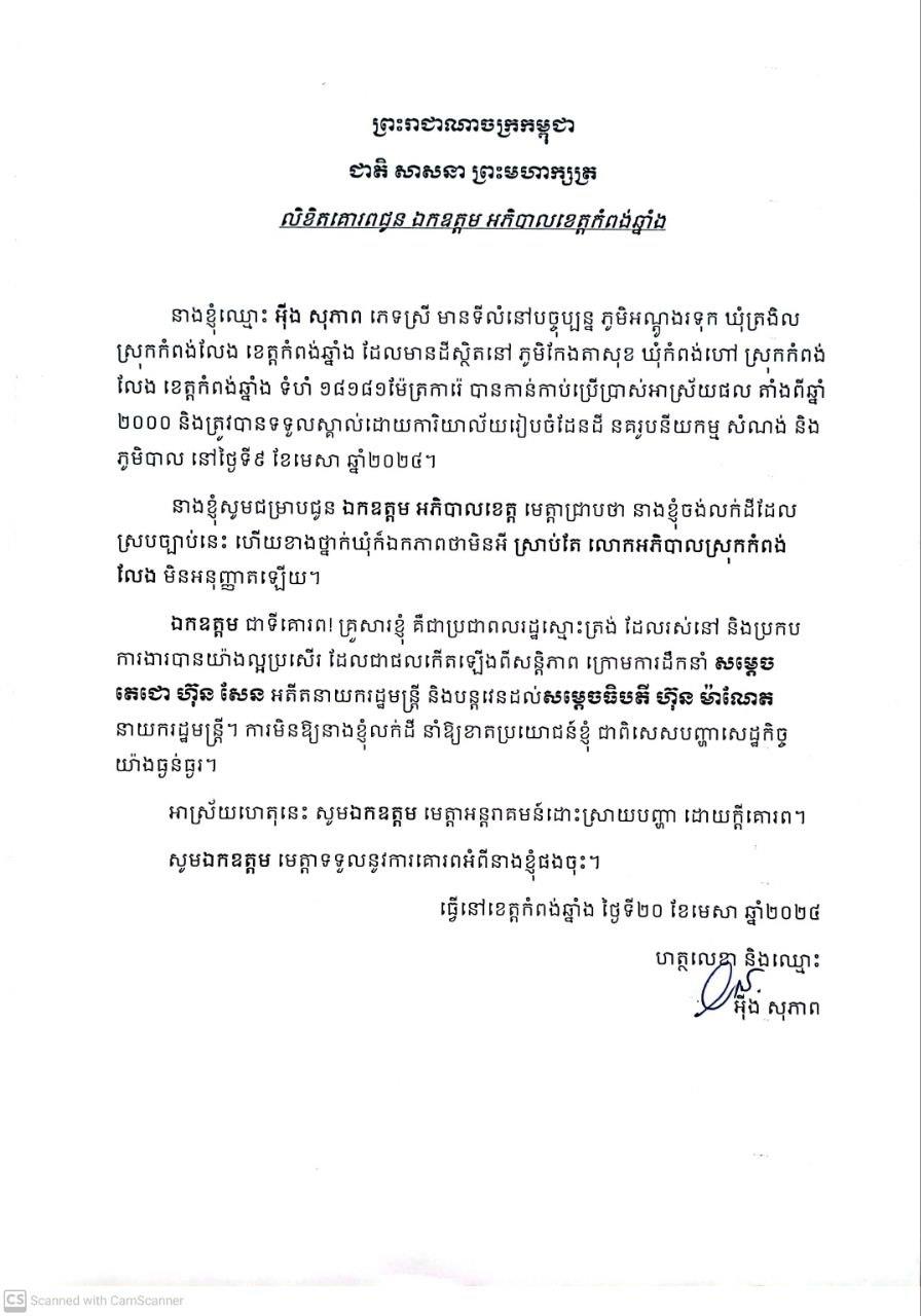 ក្នុងលិខិតផ្ញើជូនអភិបាលខេត្តកំពង់ឆ្នាំង និងបណ្តាញព័ត៌មាន Fresh News លោកស្រី បានបញ្ជាក់យ៉ាងដូច្នេះថា «នាងខ្ញុំចង់លក់ដីដែលស្របច្បាប់នេះ ហើយខាងថ្នាក់ឃុំក៏ឯកភាពថាមិនអី ស្រាប់តែ លោកអភិបាលស្រុកកំពង់លែង មិនអនុញ្ញាតឡើយ»។