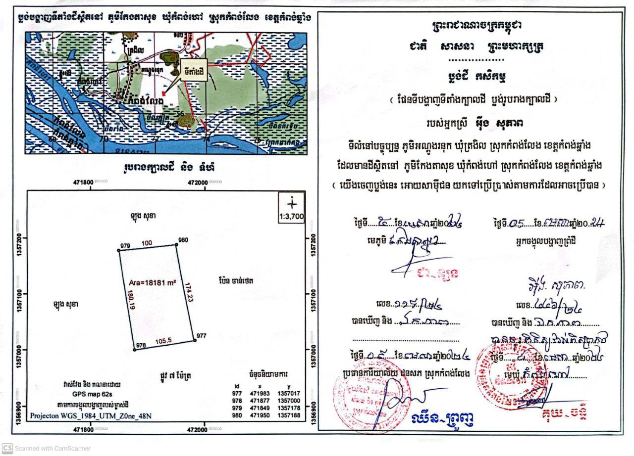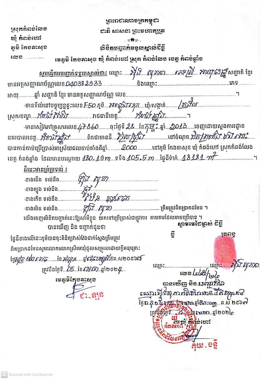 ប្រជាពលរដ្ឋរូបនេះ គឺអ្នកស្រី អ៊ីង សុភាព មានទីលំនៅបច្ចុប្បន្ន ភូមិអណ្តូងរនុក ឃុំត្រងិល ស្រុកកំពង់លែង ខេត្តកំពង់ឆ្នាំង ដែលមានដីស្ថិតនៅភូមិកែងតាសុខ ឃុំកំពង់ហៅ ស្រុកកំពង់លែង ខេត្តកំពង់ឆ្នាំង ទំហំ ១៨១៨១ម៉ែត្រការ៉េ បានកាន់កាប់ប្រើប្រាស់អាស្រ័យផល តាំងពីឆ្នាំ២០០០ និងត្រូវបានទទួលស្គាល់ដោយការិយាល័យរៀបចំដែនដី នគរូបនីយកម្ម សំណង់ និងភូមិបាល នៅថ្ងៃទី៩ ខែមេសា ឆ្នាំ២០២៤។