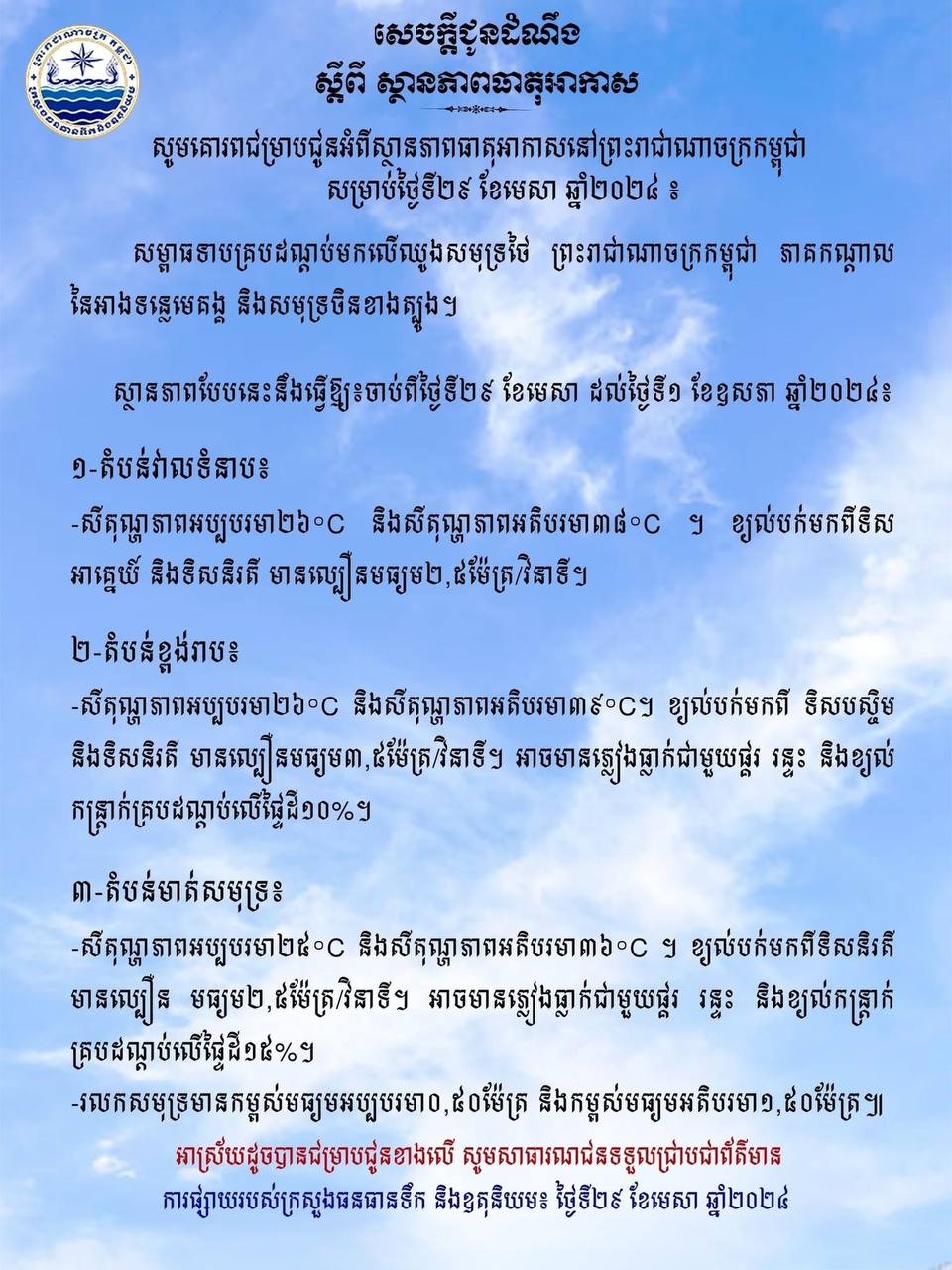 ក្រសួងធនធានទឹក បានឱ្យដឹងថា សម្ពាធទាបគ្របដណ្ដប់មកលើឈូងសមុទ្រថៃ ព្រះរាជាណាចក្រកម្ពុជា ភាគកណ្តាលនៃអាងទន្លេមេគង្គ និងសមុទ្រចិនខាងត្បូង។ ស្ថានភាពបែបនេះនឹងធ្វើឱ្យចាប់ពីថ្ងៃទី២៩ ខែមេសា ដល់ថ្ងៃទី១ ខែឧសភា ឆ្នាំ២០២៤៖