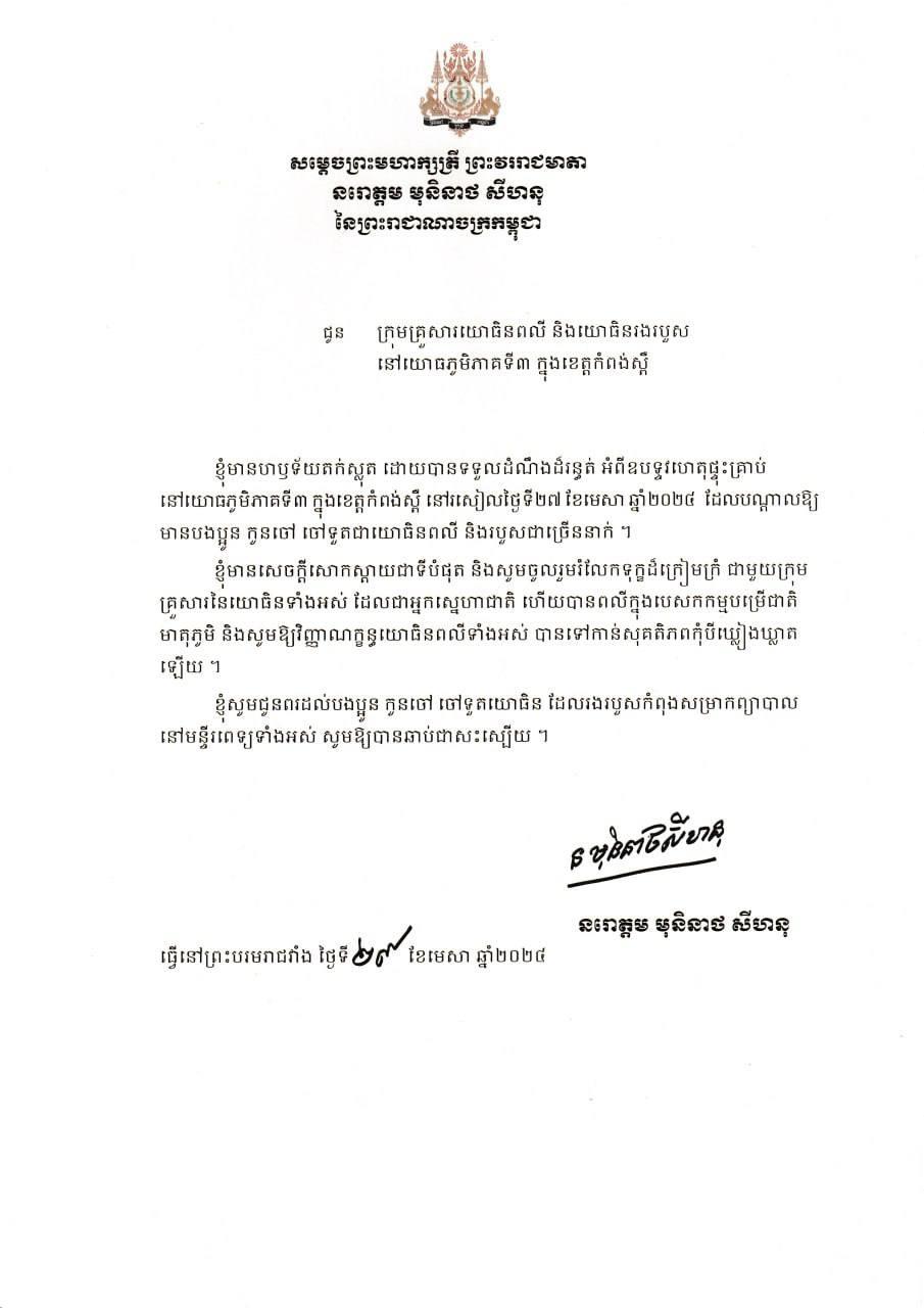 ខ្ញុំមានសេចក្តីសោកស្តាយជាទីបំផុត និងសូមចូលរួមរំលែកទុក្ខដ៏ក្រៀមក្រំ ជាមួយក្រុមគ្រួសារនៃយោធិនទាំងអស់ ដែលជាអ្នកស្នេហាជាតិ ហើយបានពលីក្នុងបេសកកម្មបម្រើជាតិ មាតុភូមិ និងសូមឱ្យវិញ្ញាណក្ខន្ធយោធិនពលីទាំងអស់ បានទៅកាន់សុគតិភពកុំបីឃ្លៀងឃ្លាតឡើយ។
