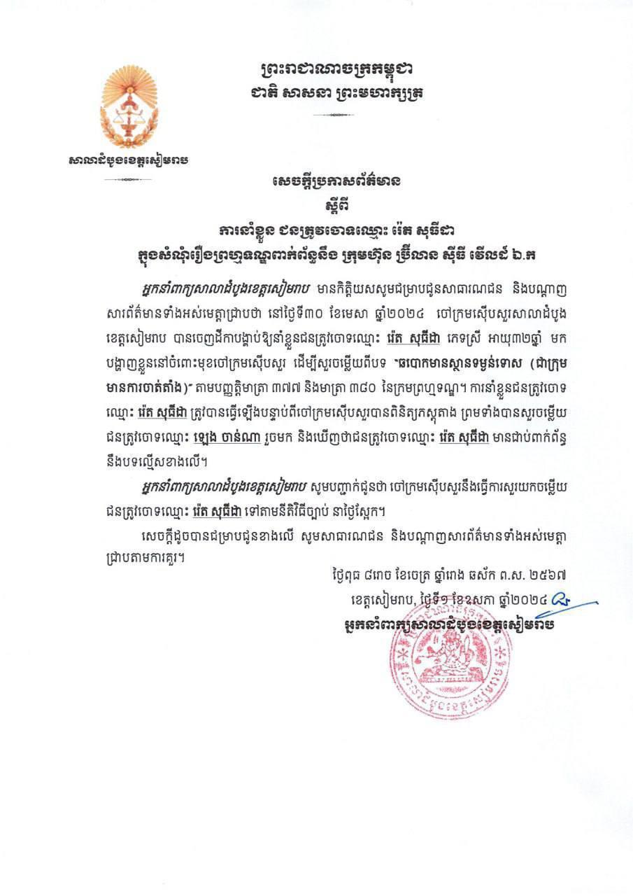 សេចក្តីប្រកាសព័ត៌មាន បានឲ្យដឹងថា នៅថ្ងៃទី៣០ ខែមេសា ឆ្នាំ២០២៤ ចៅក្រមស៊ើបសួរសាលាដំបូង ខេត្តសៀមរាប បានចេញដីកាបង្គាប់ឲ្យនាំខ្លួនជនត្រូវចោទឈ្មោះ រ៉េត សុធីដា ភេទស្រី អាយុ៣២ឆ្នាំ មក បង្ហាញខ្លួននៅចំពោះមុខចៅក្រមស៊ើបសួរ ដើម្បីសួរចម្លើយពីបទ «ឆបោកមានស្ថានទម្ងន់ទោស (ជាក្រុម មានការចាត់តាំង)» តាមបញ្ញត្តិមាត្រា ៣៧៧ និងមាត្រា ៣៨០ នៃក្រមព្រហ្មទណ្ឌ។