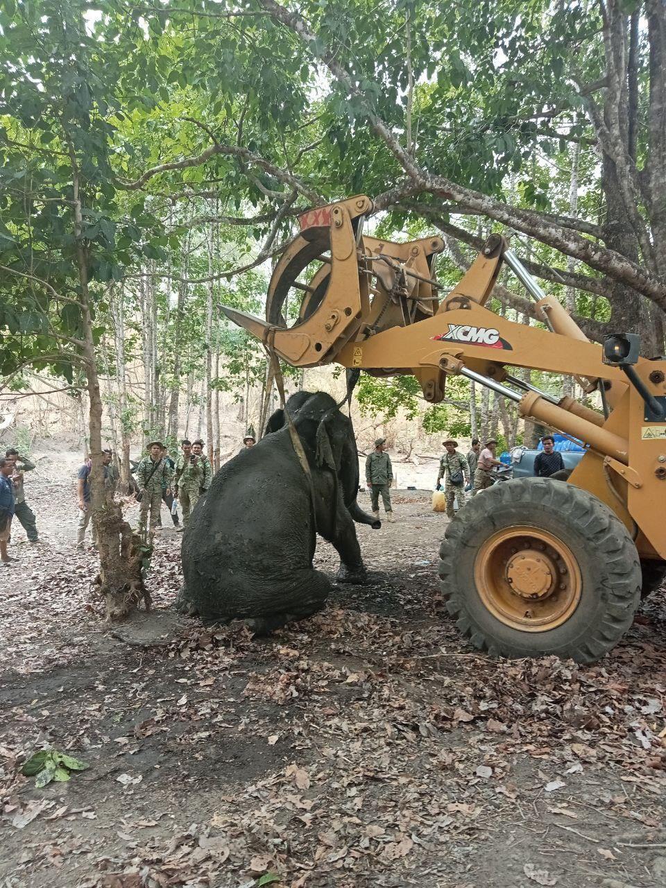 ដំរីមួយក្បាលជាប់ផុងទឹកអូរពេលចុះទៅផឹកទឹក ក្នុងដែនជម្រកសត្វព្រៃភ្នំព្រិច ស្រុកកោះញែក, មន្ដ្រីជំនាញជួយសង្គ្រោះ និងយកទៅព្យាបាលរបួសបាក់ជើងឆ្វេង