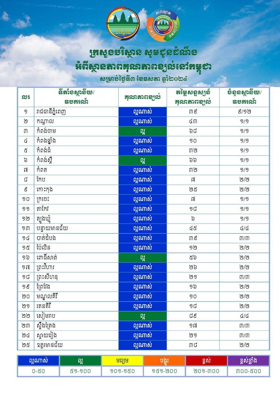 ខាក្រោមនេះ គឺជាតារាងស្តីពីស្ថានភាពខ្យល់នៅកម្ពុជា៖