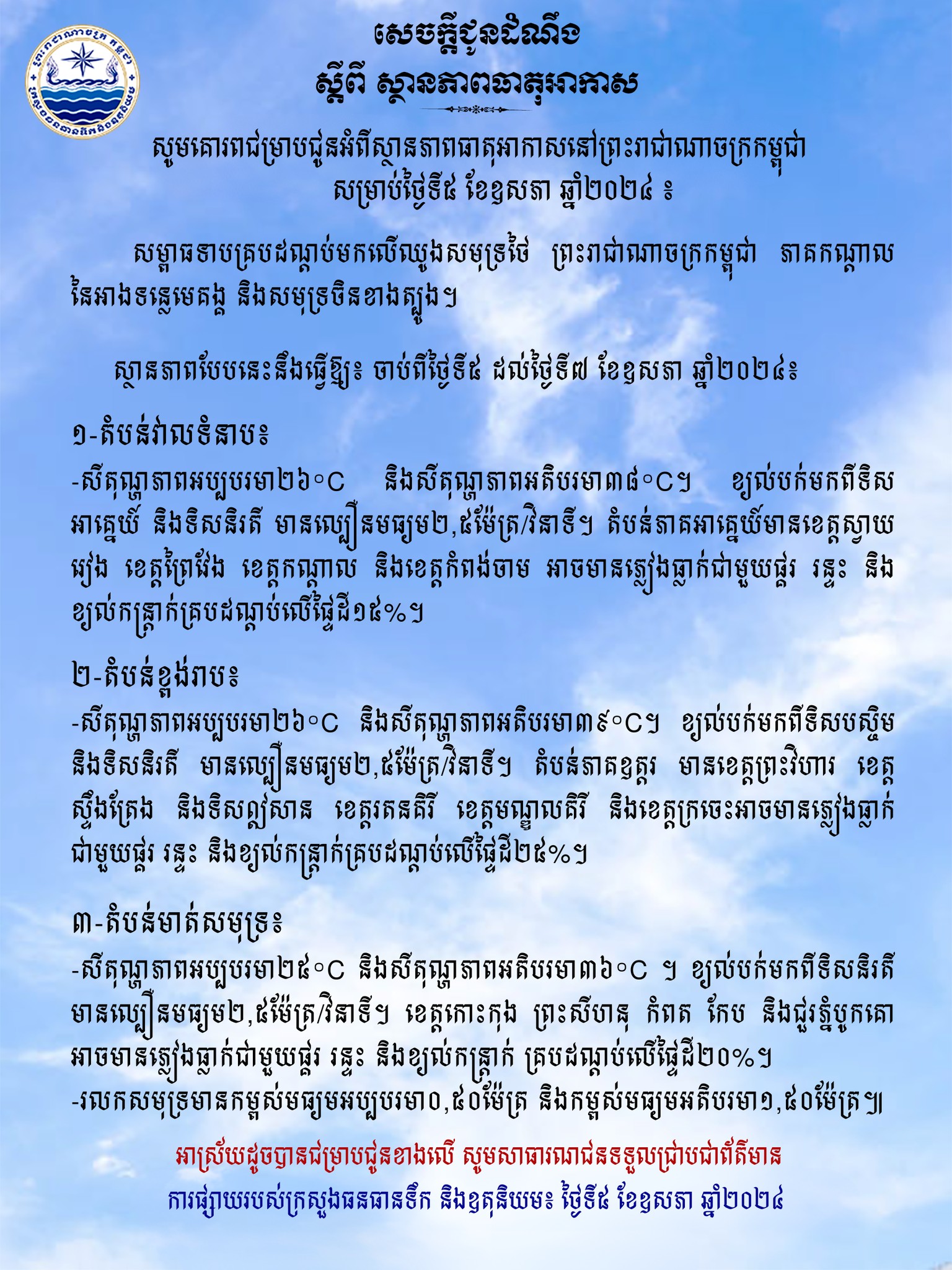 ក្រសួងបញ្ជាក់ថា សម្ពាធទាបគ្របដណ្ដប់មកលើឈូងសមុទ្រថៃ ព្រះរាជាណាចក្រកម្ពុជា ភាគកណ្តាលនៃអាងទន្លេមេគង្គ និងសមុទ្រចិនខាងត្បូង។ ស្ថានភាពបែបនេះនឹងធ្វើឱ្យ៖ ចាប់ពីថ្ងៃទី៥ ដល់ថ្ងៃទី៧ ខែឧសភា ឆ្នាំ២០២៤៖