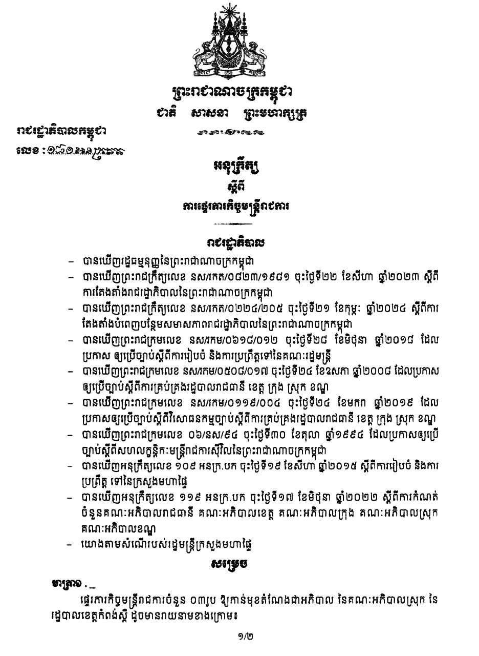 (ភ្នំពេញ)៖ សម្តេចមហាបវរធិបតី ហ៊ុន ម៉ាណែត នាយករដ្ឋមន្ត្រីនៃកម្ពុជា បានចេញអនុក្រឹត្យផ្ទេរភារកិច្ចអភិបាលស្រុកចំនួន៣រូប នៃរដ្ឋបាលខេត្តកំពង់ស្ពឺ។ នេះបើតាមអនុក្រឹត្យដែលបណ្តាញព័ត៌មាន Fresh News ទទួលបាននៅថ្ងៃទី៥ ខែឧសភានេះ។