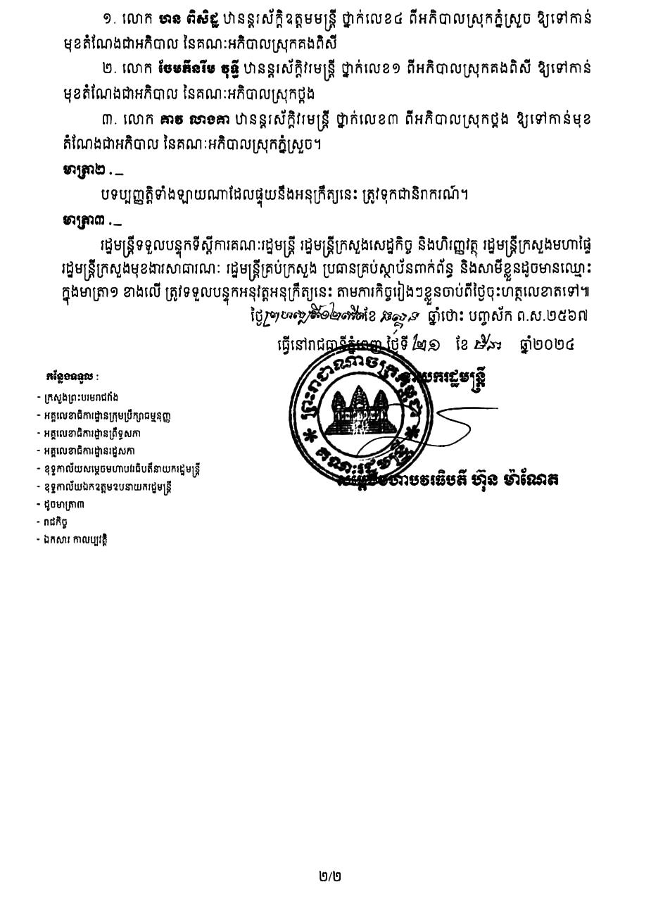 ៣៖ លោក គាវ លាងគា ឋានន្តរស័ក្ដិវរមន្ដ្រី ថ្នាក់លេខ៣ ពីអភិបាលស្រុកថ្ពង ឲ្យកាន់មុខតំណែងជា អភិបាល នៃគណៈអភិបាលស្រុកភ្នំស្រូច ៕ ផ្តល់សិទ្ធិដោយ៖ freshnews