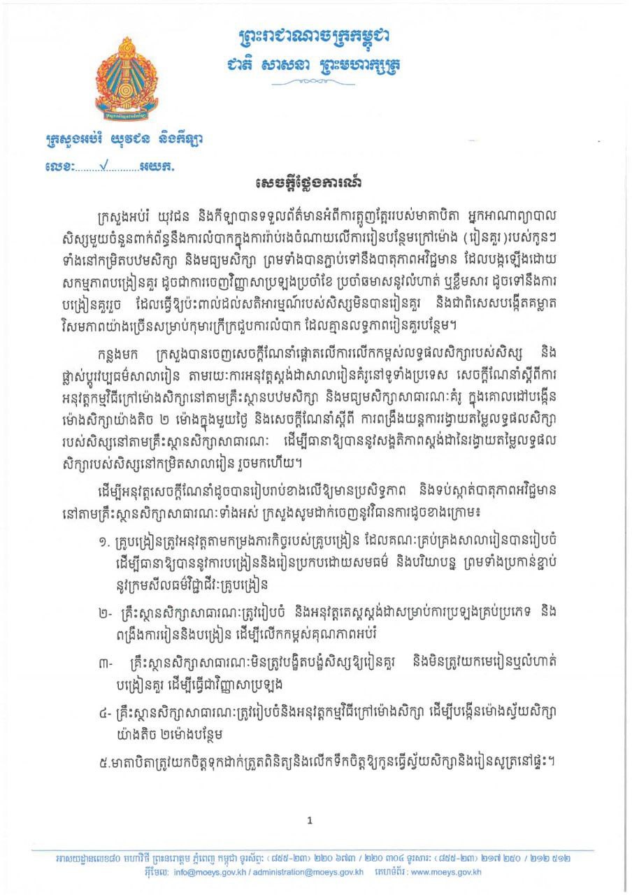 សេចក្ដីថ្លែងការណ៍បានឲ្យដឹងថា ក្រសួងអប់រំ បានទទួលព័ត៌មានអំពីការត្អូញត្អែរ របស់មាតាបិតា អ្នកអាណាព្យាបាល សិស្សមួយចំនួនពាក់ព័ន្ធនឹងការលំបាក ក្នុងការរ៉ាប់រងចំណាយ លើការរៀនបន្ថែម ក្រៅម៉ោង (រៀនគួរ) របស់កូនៗ ទាំងនៅកម្រិតបឋមសិក្សា និងមធ្យមសិក្សា ព្រមទាំងបានភ្ជាប់ទៅនឹងបាតុភាពអវិជ្ជមាន ដែលបង្កឡើងដោយ សកម្មភាពបង្រៀនគួរ ដូចជាការចេញវិញ្ញាសាប្រឡងប្រចាំខែ ប្រចាំឆមាសនូវលំហាត់ ឬខ្លឹមសារ ដូចទៅនឹងការបង្រៀនគួររួច ដែលធ្វើឲ្យប៉ះពាល់ដល់សតិអារម្មណ៍របស់សិស្សមិនបានរៀនគួរ និងជាពិសេសបង្កើតគម្លាត វិសមភាពយ៉ាងច្រើន សម្រាប់កុមារក្រីក្រ ជួបការលំបាក ដែលគ្មានលទ្ធភាពរៀនគួរបន្ថែម។