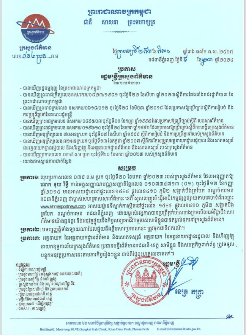 រដ្ឋមន្ដ្រីក្រសួងព័ត៌មាន លុបអាជ្ញាប័ណ្ណសារព័ត៌មានចំនួន២ ក្រោយប្រព្រឹត្តកំហុសខាងវិជ្ជាជីវៈធ្ងន់ធ្ងរ