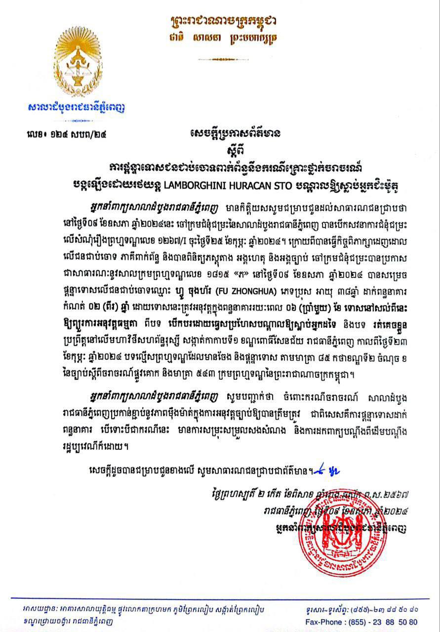ជនជាតិចិនបើករថយន្ត LAMBORGHINI បុកអ្នកជិះម៉ូតូម្នាក់បាត់បង់ជីវិត នៅខណ្ឌពោធិ៍សែនជ័យ ត្រូវបានតុលាការសម្រេចផ្តន្ទាទោសដាក់ពន្ធនាគារ ២ឆ្នាំ អនុវត្តក្នុងពន្ធនាគារ ៦ខែ