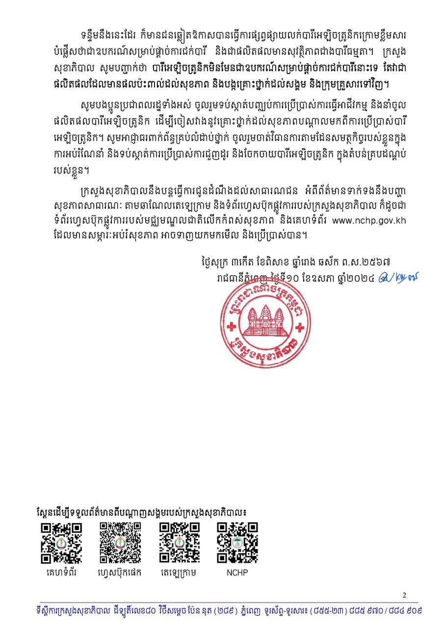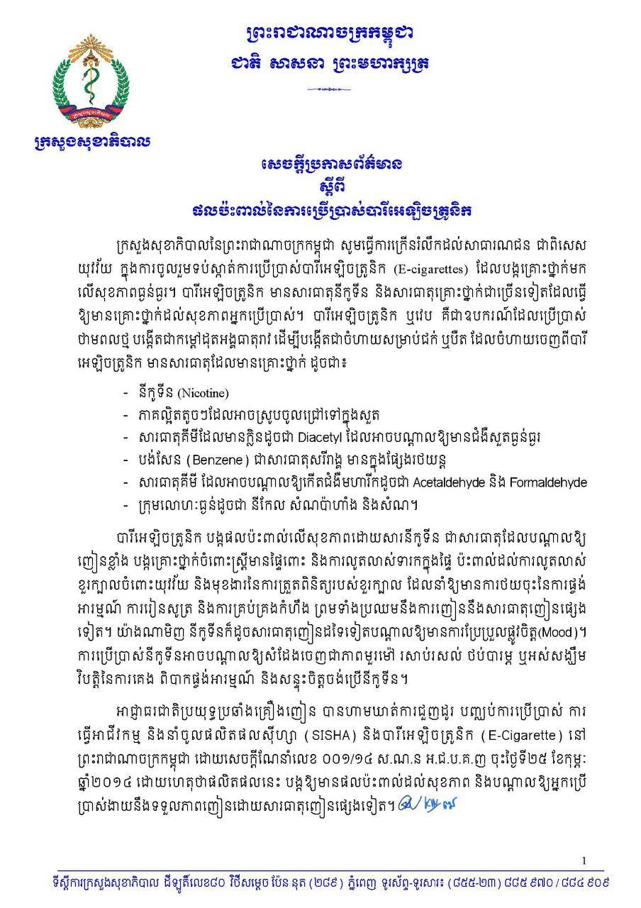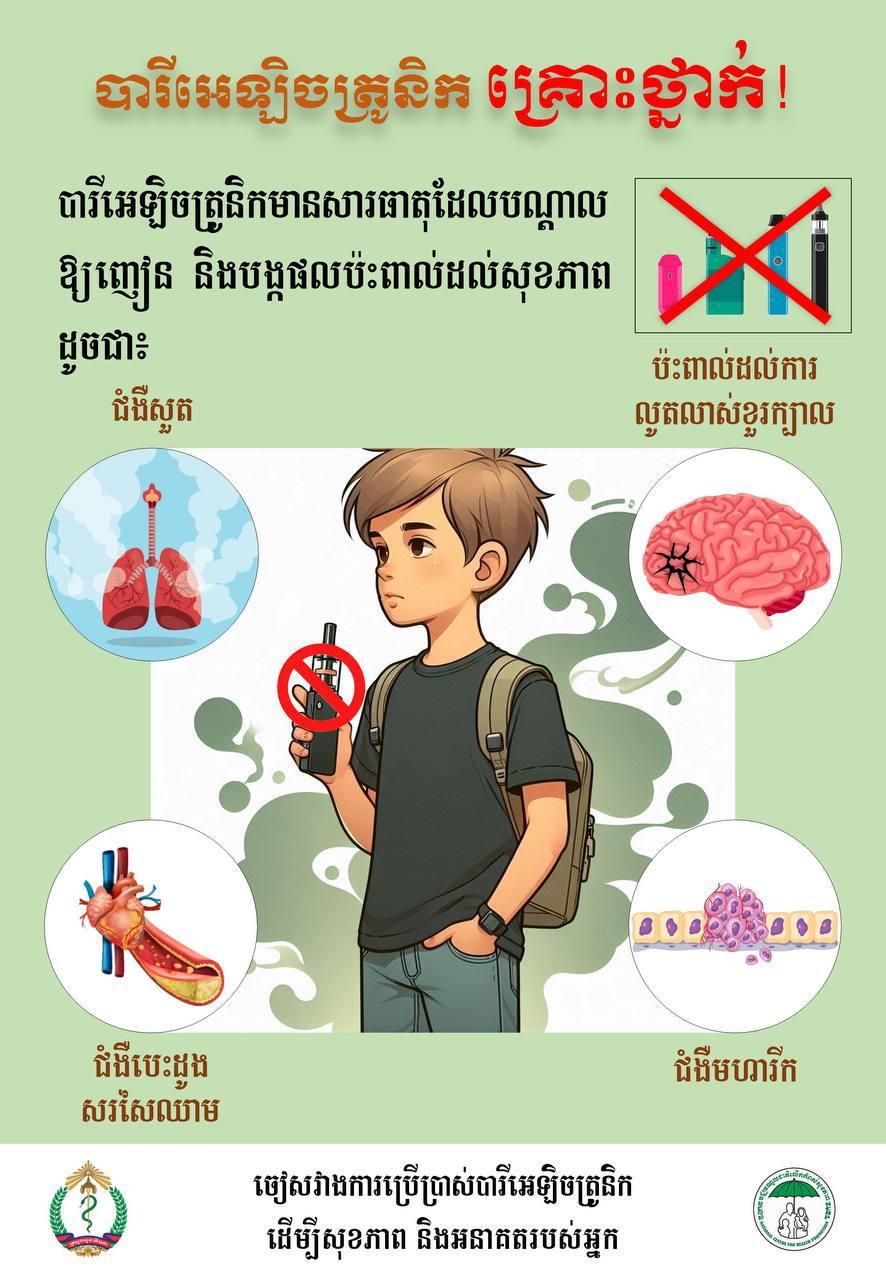 ក្រសួងសុខាភិបាល អំពាវនាវដល់ប្រជាពលរដ្ឋទាំងអស់ ចូលរួមទប់ស្កាត់បញ្ឈប់ការប្រើប្រាស់ ការធ្វើអាជីវកម្ម និងនាំចូលផលិតផលបារីអេឡិចត្រូនិក ដើម្បីចៀសវាងនូវគ្រោះថ្នាក់ធ្ងន់ធ្ងរដល់សុខភាព