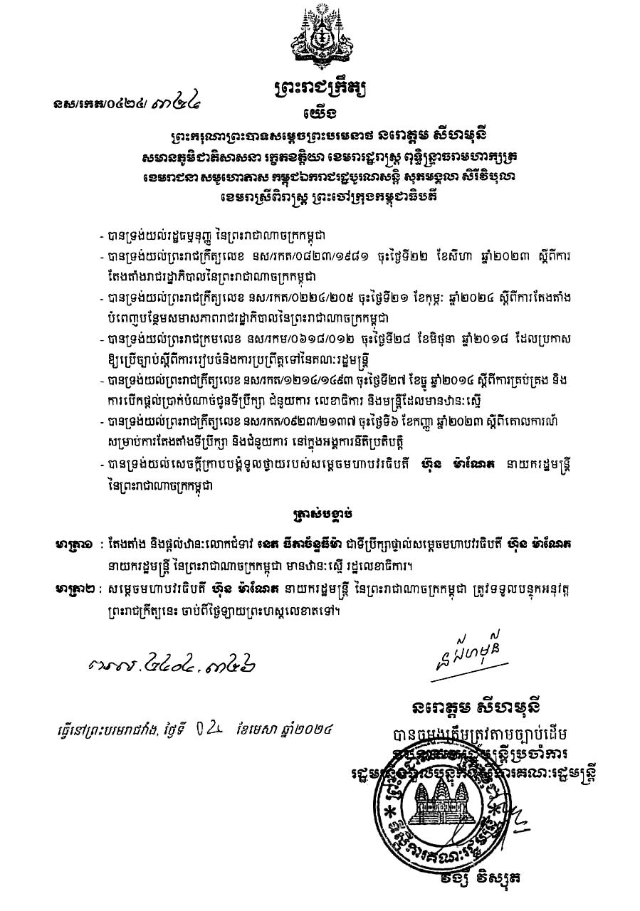 (ភ្នំពេញ)៖ ព្រះករុណា ព្រះបាទសម្ដេច ព្រះបរមនាថ នរោត្តម សីហមុនី ព្រះមហាក្សត្រនៃកម្ពុជា សព្វព្រះរាជហឫទ័យត្រាស់បង្គាប់តែងតាំង លោកស្រី នេត ធីតាច័ន្ទធីម៉ា ជាទីប្រឹក្សាផ្ទាល់សម្ដេចមហាបវរធិបតី ហ៊ុន ម៉ាណែត នាយករដ្ឋមន្ដ្រីនៃកម្ពុជា ឋានៈស្មើរដ្ឋលេខាធិការ។ នេះបើតាមព្រះរាជក្រឹត្យដែលបណ្ដាញព័ត៌មាន Fresh News ទទួលបាននៅព្រឹកថ្ងៃទី១៣ ខែឧសភា ឆ្នាំ២០២៤។