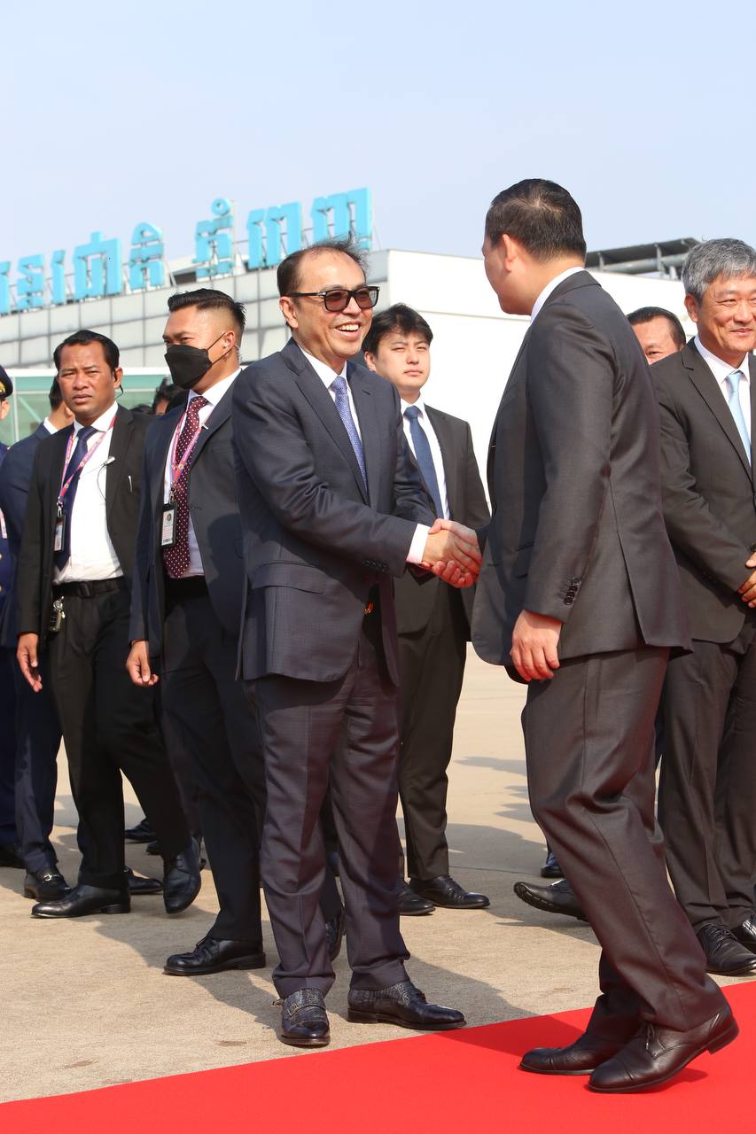 អញ្ជើញអមដំណើរសម្ដេចធិបតី និងលោកជំទាវបណ្ឌិត រួមមាន លោកឧបនាយករដ្ឋមន្ត្រី ស៊ុន ចាន់ថុល អនុប្រធានទី១ ក្រុមប្រឹក្សាអភិវឌ្ឍន៍កម្ពុជា លោកឧបនាយករដ្ឋមន្ត្រី សុខ ចិន្តាសោភា រដ្ឋមន្ត្រីការបរទេស និងសហប្រតិបត្តិការអន្តរជាតិ ព្រមទាំងរដ្ឋមន្ត្រី មន្ត្រីសំខាន់ៗនៃរាជរដ្ឋាភិបាល និងតំណាងពីសភាពាណិជ្ជកម្មកម្ពុជា។