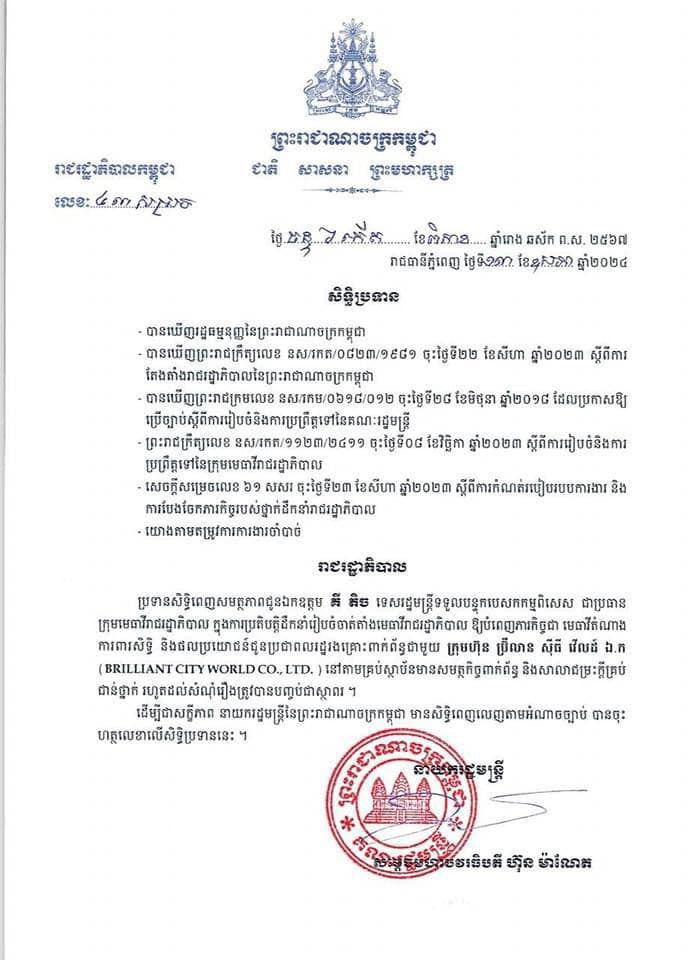 ក្រោយពេលដែលឃើញមានផ្សព្វផ្សាយ តាមប្រព័ន្ធបណ្ដាញសង្គមអំពីករណីទាមទារសំណង របស់ប្រជាពលរដ្ឋដែលបានវិនិយោគ នៅលើគម្រោង ប្រ៊ីលានស៊ីធី នៅខេត្តសៀមរាប របស់អតីតឧកញ៉ា ឡេង ចាន់ណា, នៅក្នុងអំឡុងពាក់កណ្តាលខែកុម្ភ: ឆ្នាំ២០២៤ ខ្ញុំបានប្រគល់ភារកិច្ចជូន ឯកឧត្តម សាយ សំអាល់ ឧបនាយករដ្ឋមន្ត្រី រដ្ឋមន្ត្រីក្រសួងដែនដី នគររូបនីយកម្ម និងសំណង់ ក៏ដូចជា ជូនឧត្តម ប្រាក់ សោភ័ណ្ឌ អភិបាលនៃគណៈអភិបាលខេត្តសៀមរាប និងក្រុមជំនួយការច្បាប់របស់ខ្ញុំ ដើម្បីស្រាវជ្រាវ ក៏ដូចជារិះរកដំណោះស្រាយលើករណីនេះ។