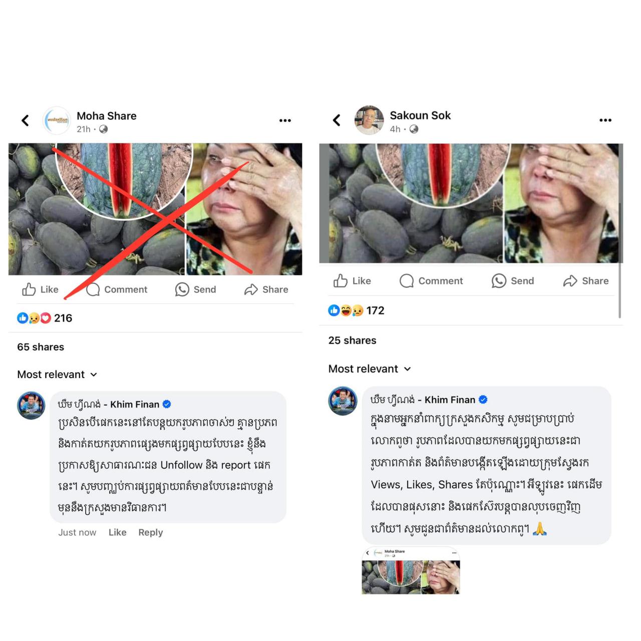 តាមរយៈបណ្តាញសង្គម នៅថ្ងៃទី១៥ ខែឧសភានេះ លោក ឃឹម ហ្វីណង់ បានលើកឡើងថា៖ «ទង្វើបែបនេះមិនបានជួយដល់វិស័យកសិកម្មនោះទេ ការយករូបភាពចាស់ៗពីកន្លែងដទៃមកប្រឌិតជាសាច់រឿងដើម្បីវាយប្រហារ ឬបំភ្លៃជាព័ត៌មាន គ្រាន់តែដើម្បីឱ្យគេLikes គេ Shares និងចាប់អារម្មណ៍ពីខ្លួនឯង ប្រៀបបាននឹងការយកកសិកររបស់យើងមកលេងសើចយ៉ាងដូច្នេះដែរ»។