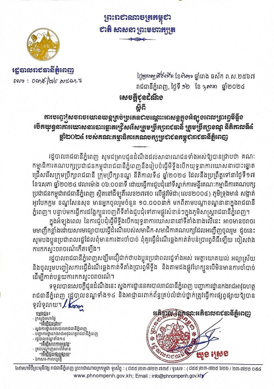 រដ្ឋបាលរាជធានីភ្នំពេញ ជូនដំណឹងពីការបញ្ចៀសចរាចរណ៍យានយន្តគ្រប់ប្រភេទជាបណ្តោះអាសន្ន ក្នុងអំឡុងពេលរៀបចំធ្វើមីទ្ទីងបើកយុទ្ធនាការឃោសនាបោះឆ្នោតជ្រើសរើសក្រុមប្រឹក្សារាជធានី ក្រុមប្រឹក្សាខណ្ឌ នីតិកាលទី៤