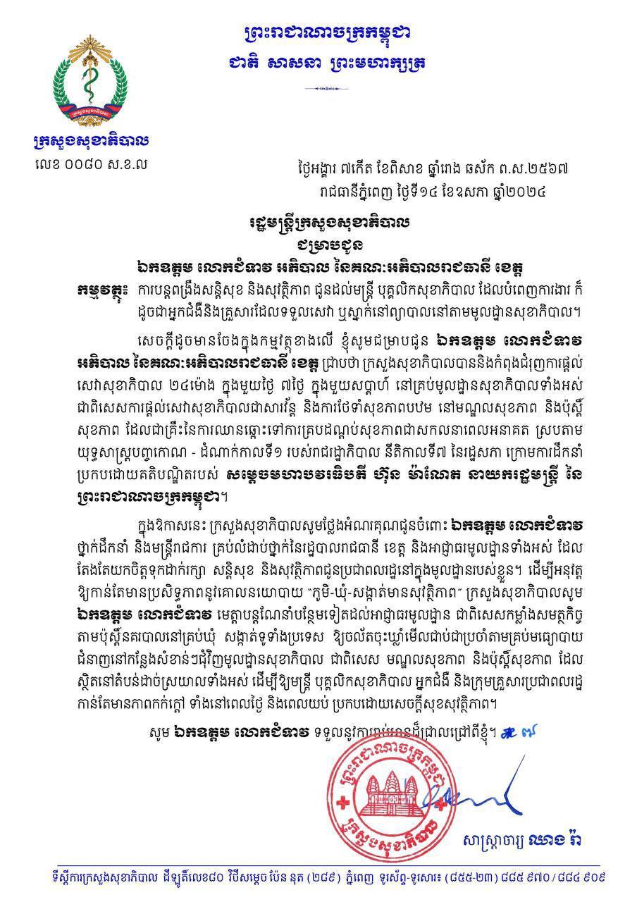 រដ្ឋមន្ត្រីសុខាភិបាល ស្នើដល់អាជ្ញាធរគ្រប់រាជធានីខេត្ត បន្តពង្រឹងសន្តិសុខ និងសុវត្ថិភាព ជូនដល់មន្ត្រី អ្នកជំងឺនិងគ្រួសារដែលទទួលសេវា ឬស្នាក់នៅព្យាបាលតាមមូលដ្ឋានសុខាភិបាល