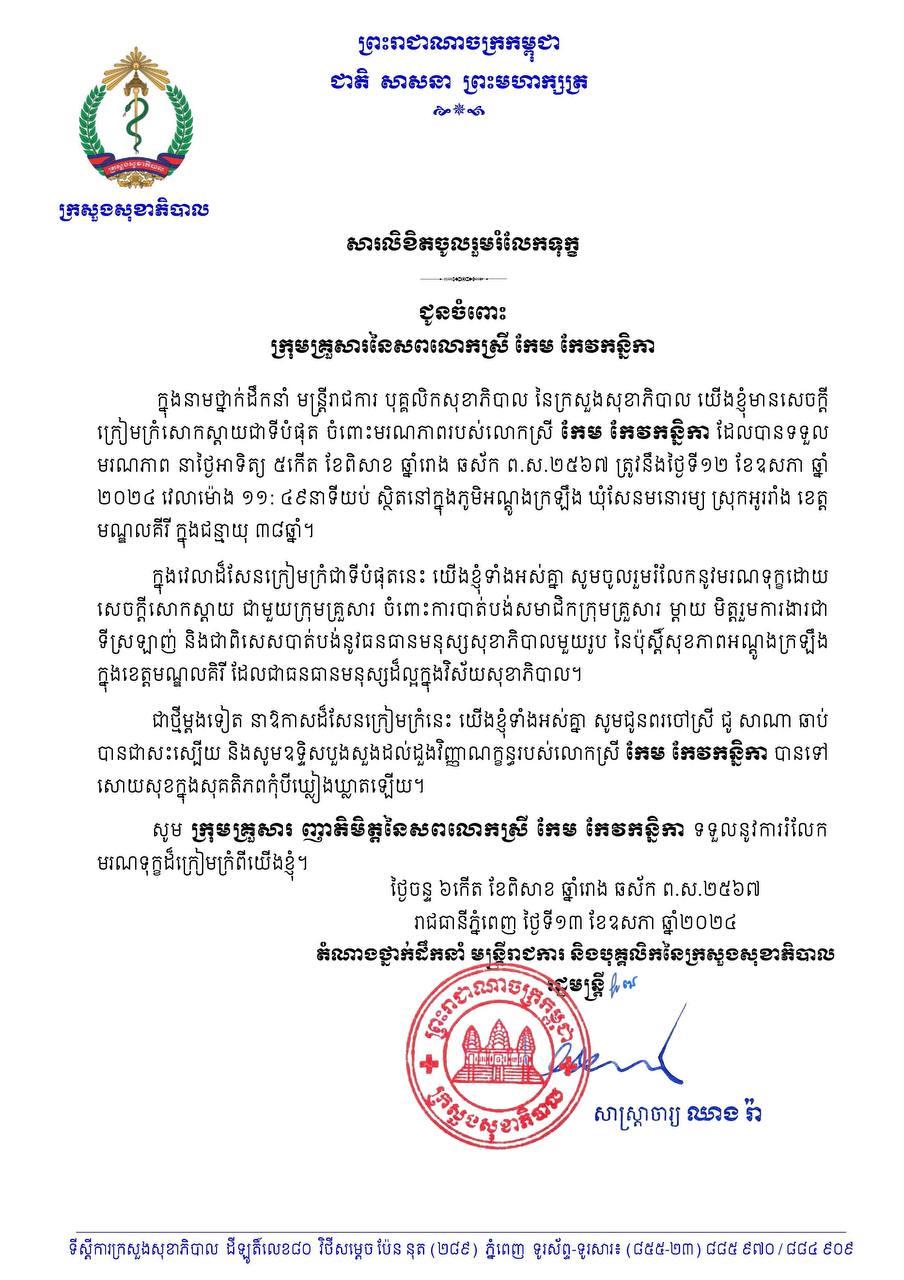 ការស្នើសុំយ៉ាងដូច្នេះ បន្ទាប់ពីអ្នកគ្រូពេទ្យម្នាក់ត្រូវខ្មាន់កាំភ្លើង ចូលបាញ់ប្រហារដល់បន្ទប់ប៉ុស្ដិ៍សុខភាពអណ្ដូងក្រឡឹង នៅស្រុកអូររាំង កាលពីរំលងអធ្រាត្រឈានចូលថ្ងៃទី១២ ខែឧសភា ឆ្នាំ២០២៤ ស្ថិតនៅភូមិអណ្ដូងក្រឡឹង ឃុំសែនមនោរម្យ ស្រុកអូររាំង ខេត្តមណ្ឌលគិរី។ ក្នុងឱកាសលោករដ្ឋមន្ដ្រីសុខាភិបាល ក៏បានចាត់តំណាងភ្ជាប់ជាមួយនឹងលិខិត ចូលរួមរំលែកទុក្ខ ដល់ក្រុមគ្រួសារនៃសពផងដែ។
