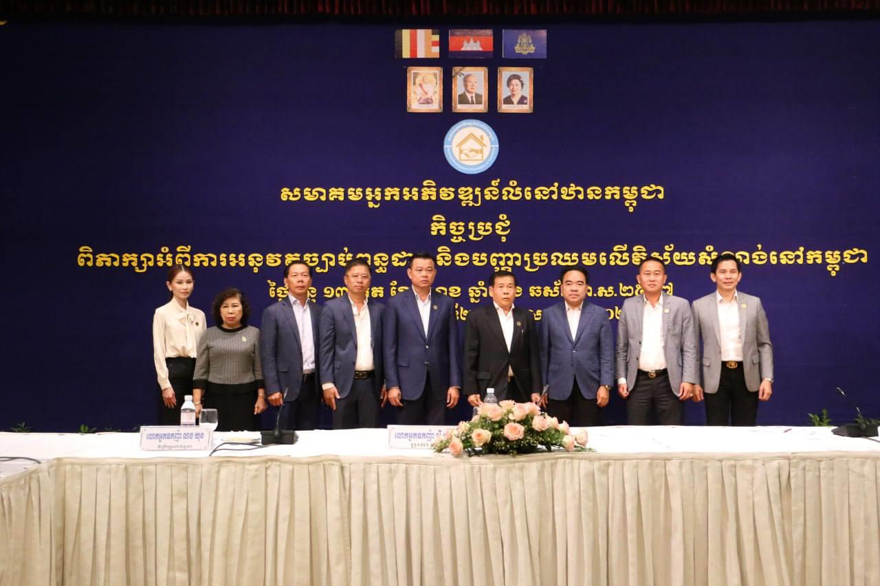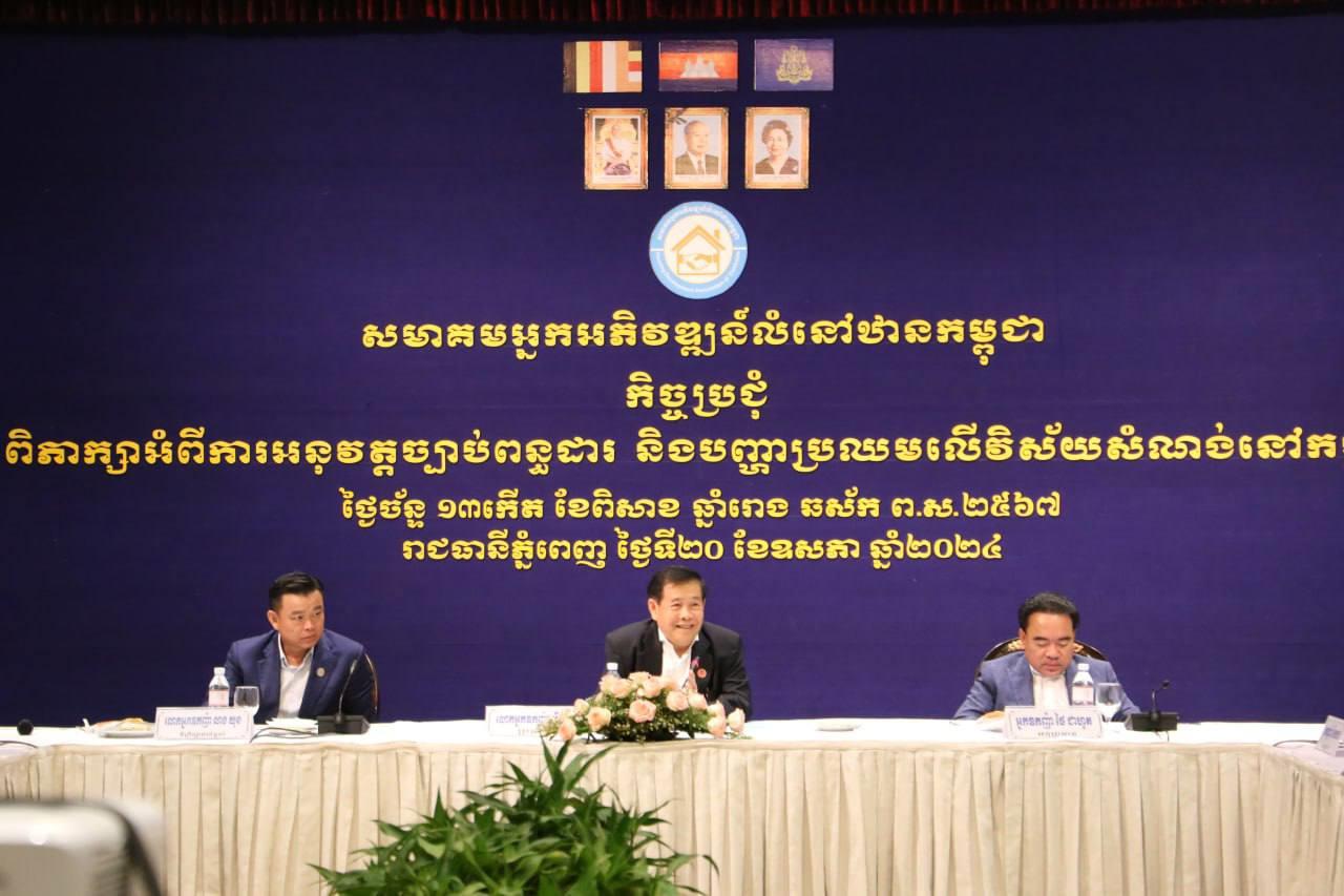 (ភ្នំពេញ)៖ សមាគមអ្នកអភិវឌ្ឍន៍លំនៅឋានកម្ពុជា នៅរសៀលថ្ងៃទី២០ ខែឧសភា ឆ្នាំ២០២៤នេះ បានរៀបចំកិច្ចប្រជុំពិភាក្សាអំពីការអនុវត្តច្បាប់ពន្ធដារ និងបញ្ហាប្រឈមលើវិស័យសំណង់នៅកម្ពុជា ដឹកនាំដោយលោកអ្នកឧកញ៉ា លី ហួរ ប្រធានសមាគមអ្នកអភិវឌ្ឍន៍លំនៅឋានកម្ពុជា។