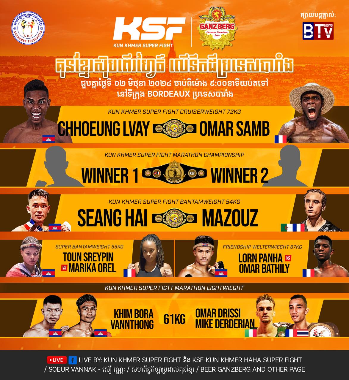 ក្រោយចប់ព្រឹត្តិការណ៍ទី១ Ganzberg និង Kun Khmer Super Fight បន្តដឹកនាំកីឡាករគុនខ្មែរចូលរួមប្រកួត ក្នុងកម្មវិធីប្រដាល់ដ៏ធំមួយទៀតរបស់បារាំង BELLE EQUIPE នៅចំកណ្ដាលទីក្រុងបារីស នាថ្ងៃទី២៧ ខែមិថុនា ឆ្នាំ២០២៤ រួមមាន គ្រូក្មេងកំពូលស្នៀត សៀងហៃ, នាគចម្បាំងគុនខ្មែរ លន បញ្ញា, លេងអាវុធ ឡៅ ចិត្រា និង ម្ចាស់មេដាយមាសទម្ងន់ធ្ងន់ ស៊ីហ្គេម ២០២៣ ព្រំ សំណាង ត្រៀមតតាំងជាមួយជើងខ្លាំង ម្ចាស់ផ្ទះ បារាំង និងកីឡាករមកពី អេស្ប៉ាញ និងអង់គ្លេស ជាដើម។ ឯបេក្ខភាពគុនខ្មែរ មួយរូបទៀត រវាង ឃីម បូរ៉ា និង ឈុត សេរីវ៉ាន់ថង អ្នកដែលឈ្នះខ្សែក្រវាត់ KSF នាថ្ងៃទី០២ ខែមិថុនា នឹងត្រូវបន្តបេសសកម្មធំមួយទៀត ក្នុងកម្មវិធី BELLE EQUIPE ជាមួយគ្នានេះផងដែរ ដោយការប្រកួតលក្ខណៈម៉ារ៉ាតុន ជាមួយជើងខ្លាំង បារាំង, អេស្ប៉ាញ និង អង់គ្លេស។