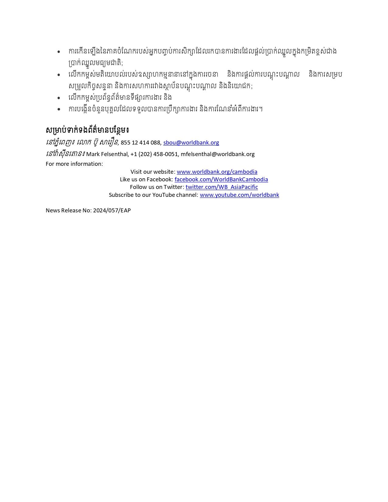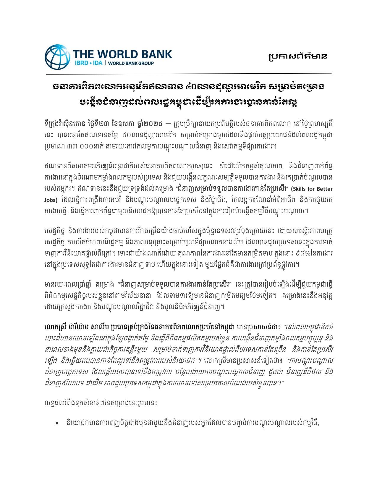 (ភ្នំពេញ)៖ ក្រុមប្រឹក្សានាយកប្រតិបត្តិរបស់ធនាគារពិភពលោក បាន​អនុម័តឥណទានតម្លៃ ៤០លានដុល្លារអាមេរិក សម្រាប់​គម្រោង​មួយ ​ដែល​នឹង​ផ្តល់​អត្ថ​ប្រយោជន៍​ដល់​ពលរដ្ឋ​កម្ពុជា ប្រមាណ៣៣ ០០០នាក់ តាមរយៈ​ការកែលម្អ​ការ​បណ្តុះបណ្តាលជំនាញ​ និងសេវាកម្មទីផ្សារការងារ​។ នេះបើតាមសេចក្ដីប្រកាសព័ត៌មាន ដែលបណ្ដាញព័ត៌មាន Fresh News ទទួលបាននៅថ្ងៃទី២៤ ខែឧសភា ឆ្នាំ២០២៤។